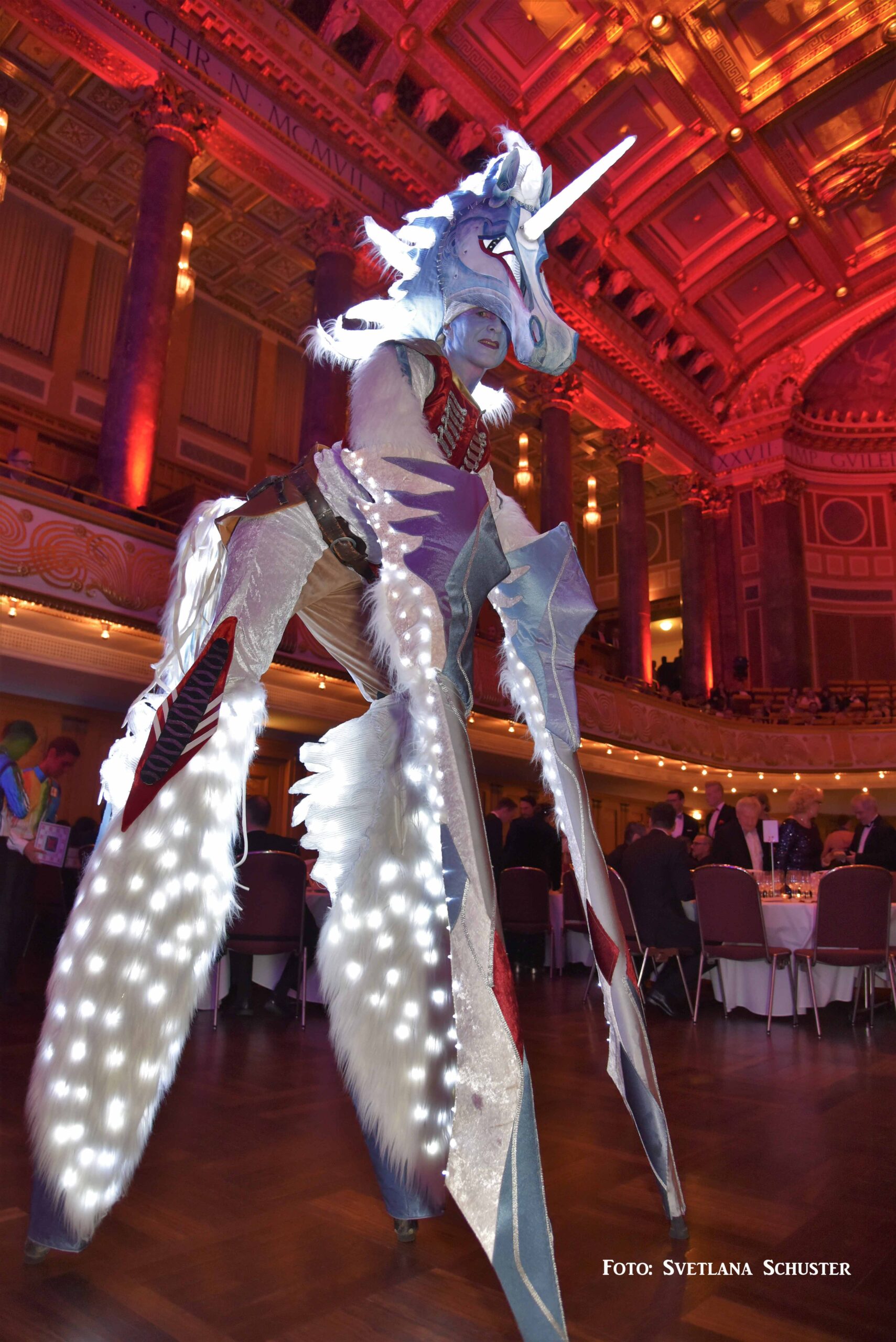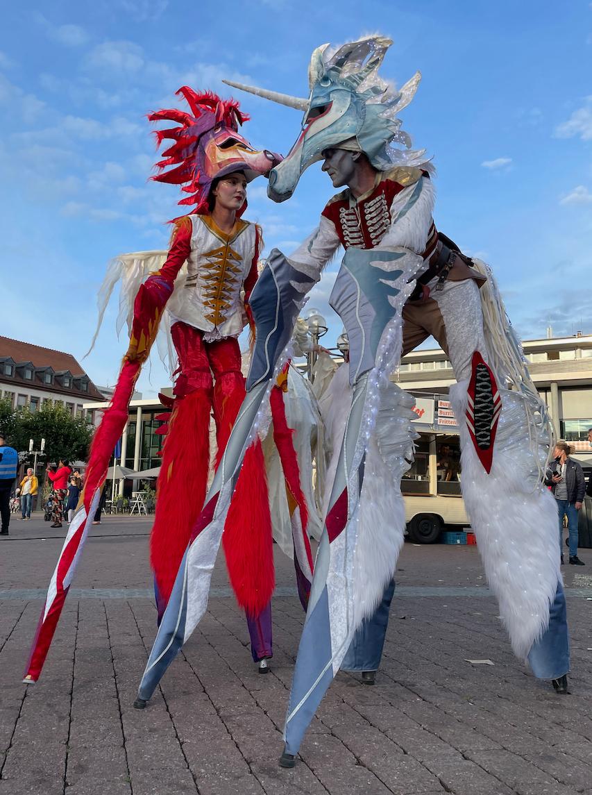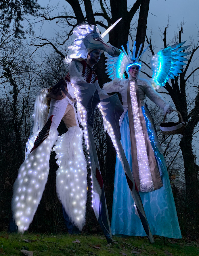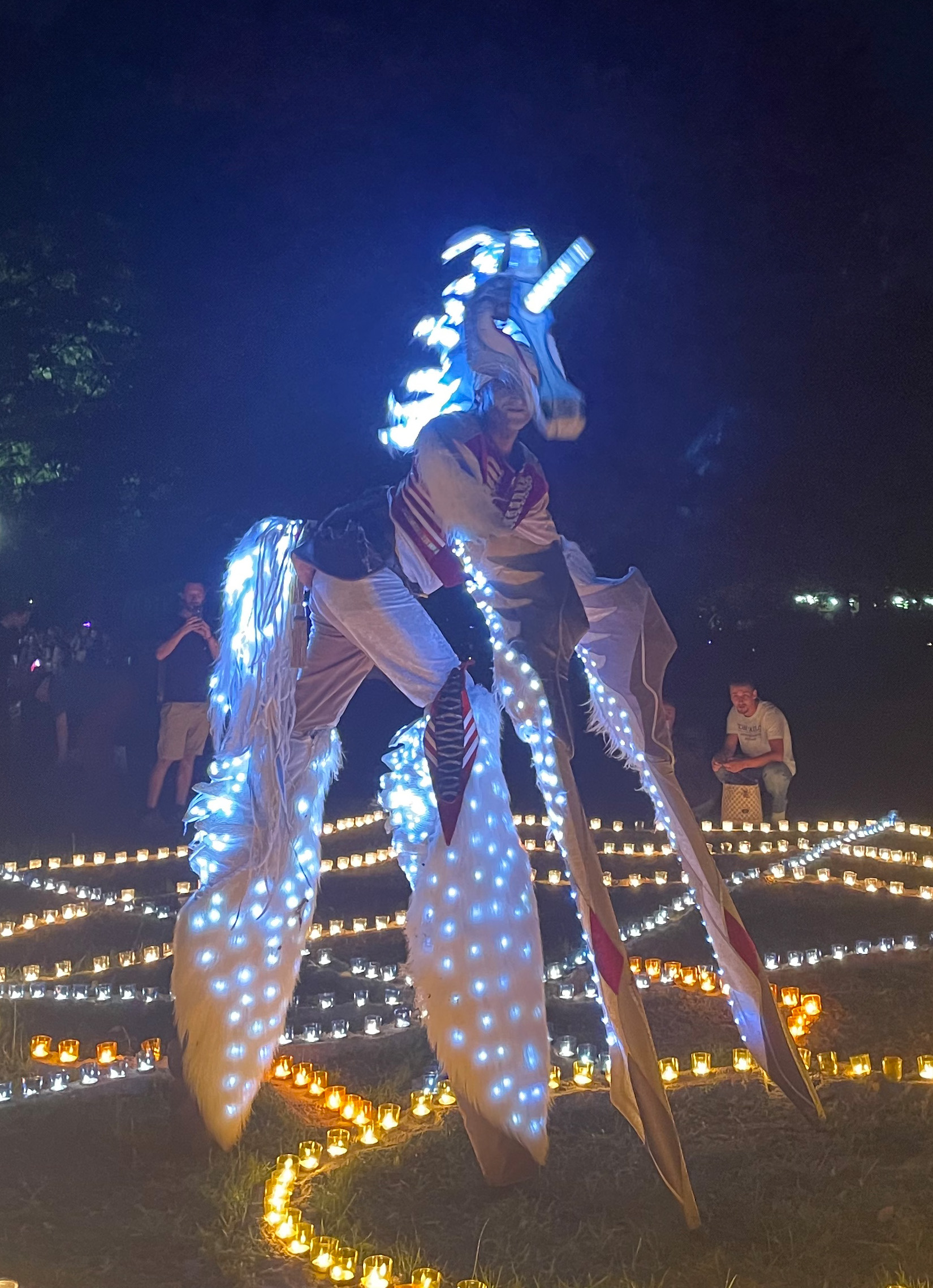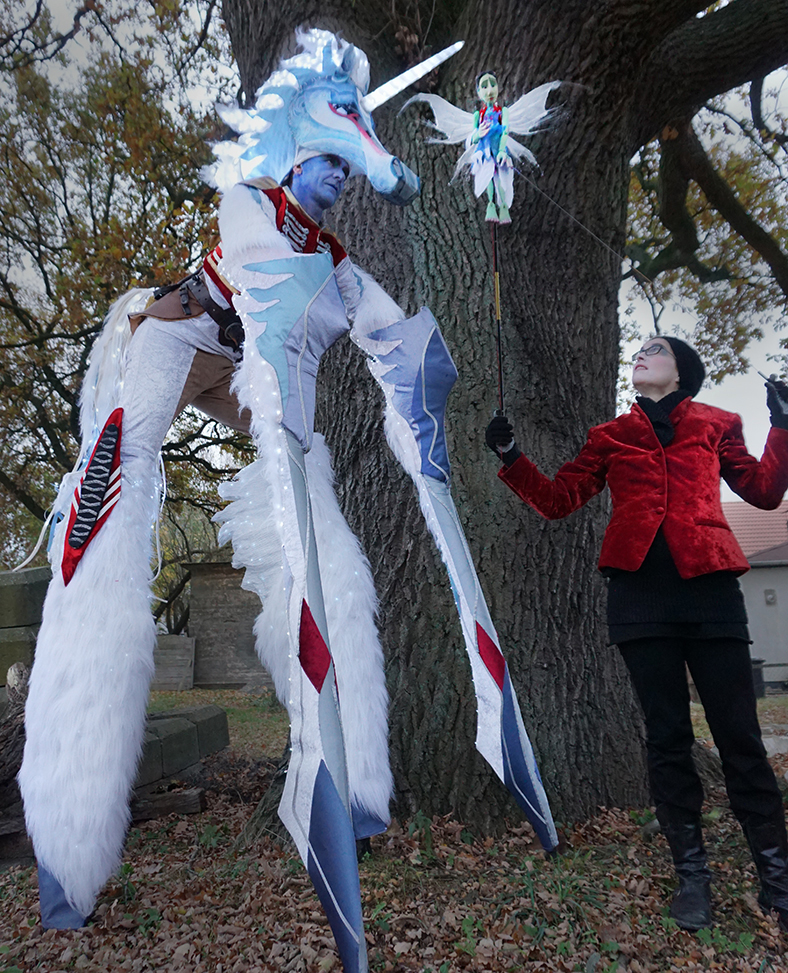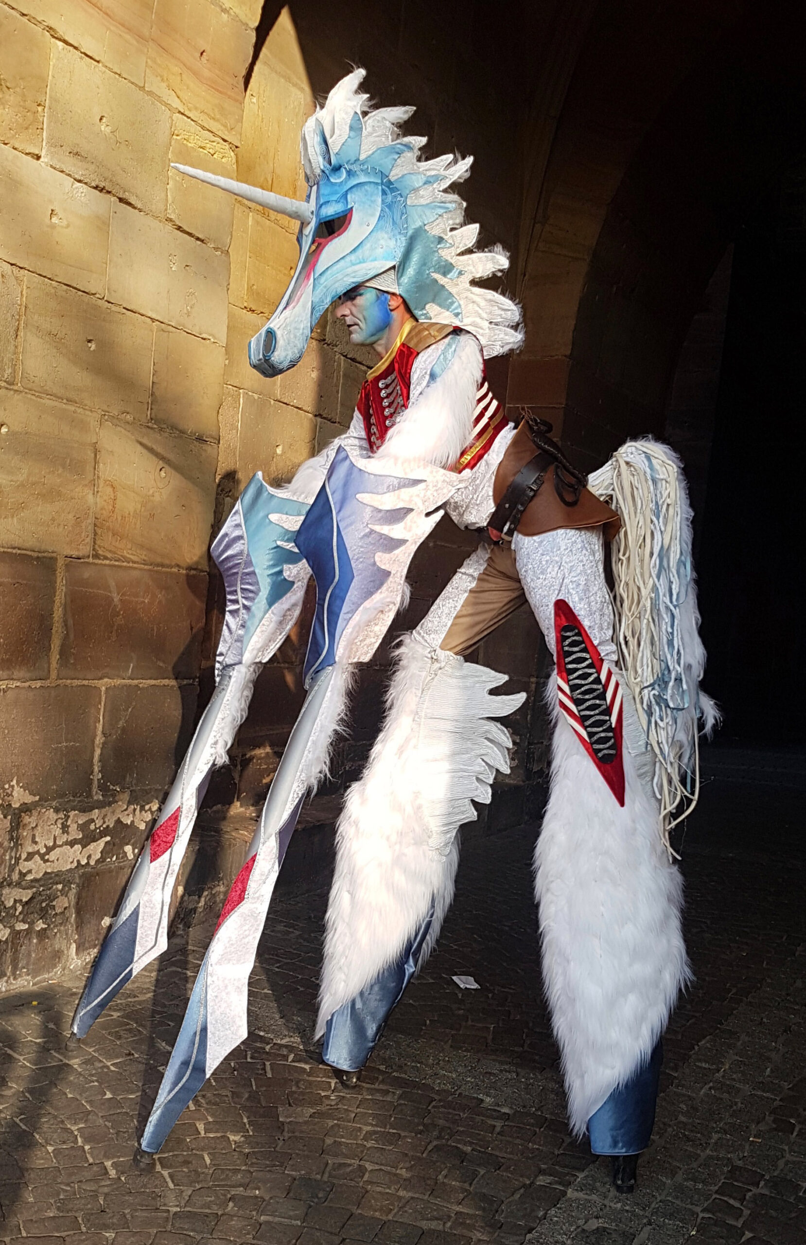 Märchenhaft, das Einhorn verwandelbar in ein Zirkuspferd. Azurro ist eine mystische Pferdefigur, Pferd und Reiter gleichermaßen, galoppiert es dem Publikum entgegen. Ungeduldig wiehernd oder sanft schnuppernd nimmt es Kontakt auf. Manchmal reiten Kinder auf seinem starken Rücken ein Stück mit in eine andere Welt. Wenn es dunkel wird, zeichnen Azurros beleuchtete Mähne und sein Lichtschweif eine wilde Silhouette in den Nachthimmel.