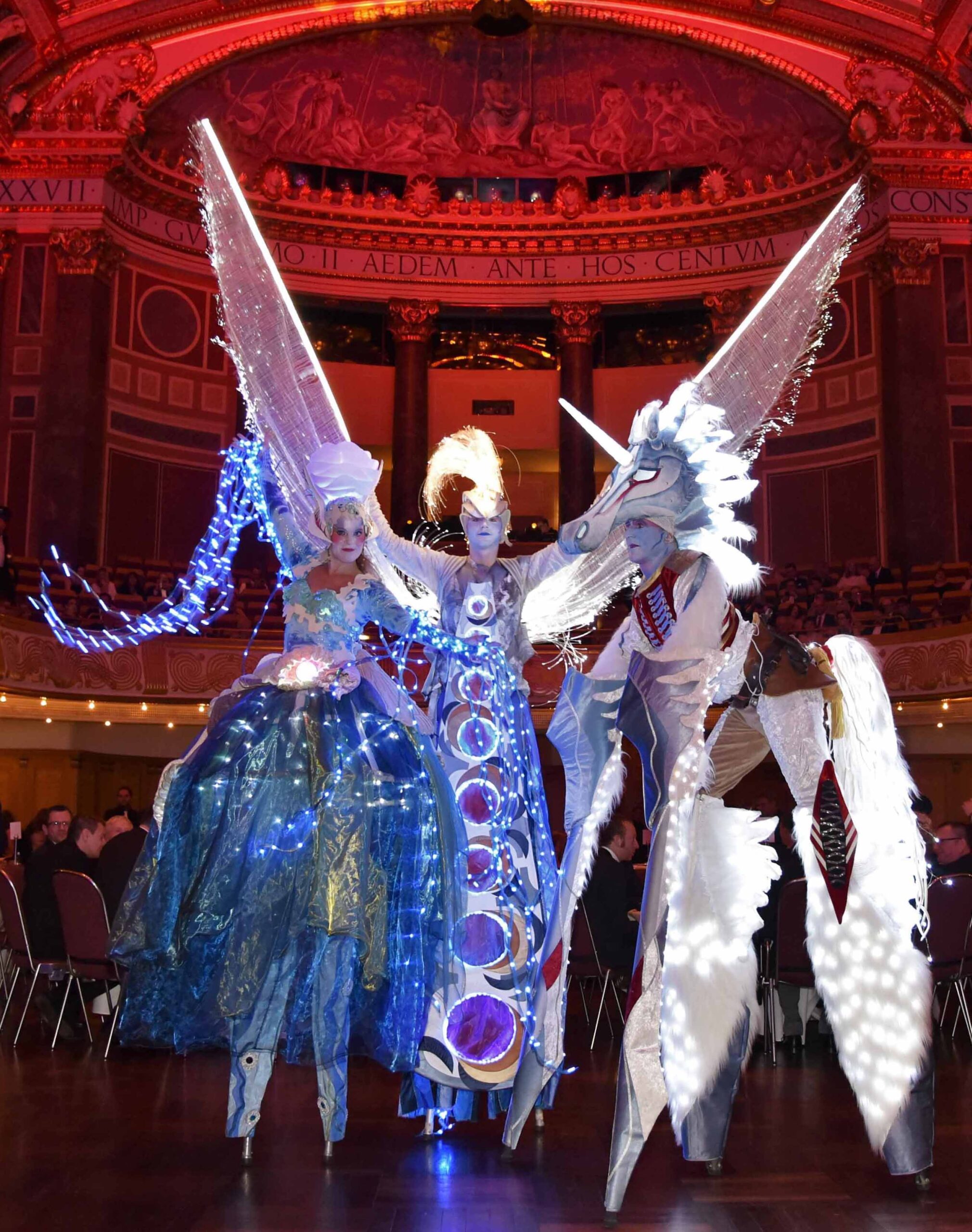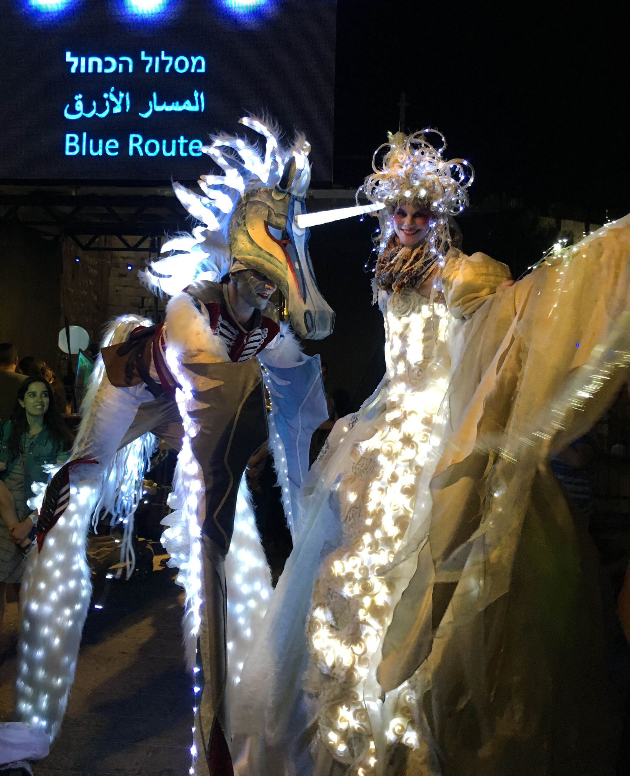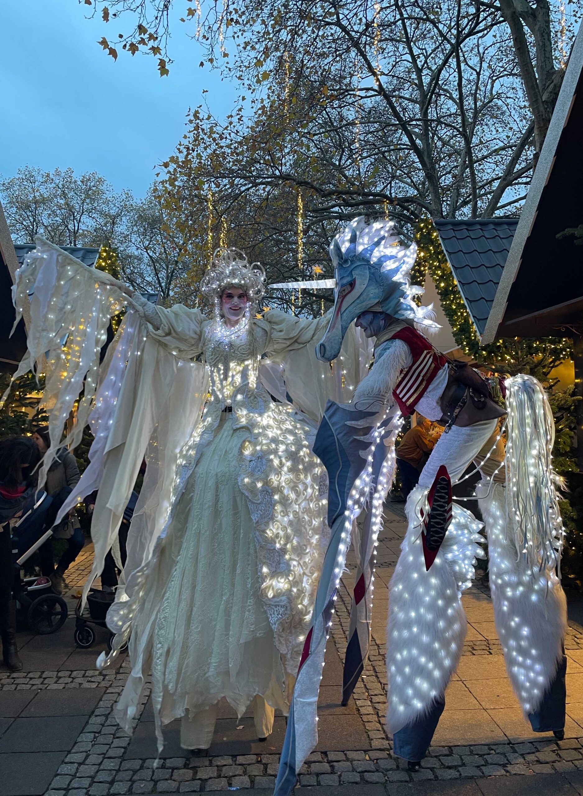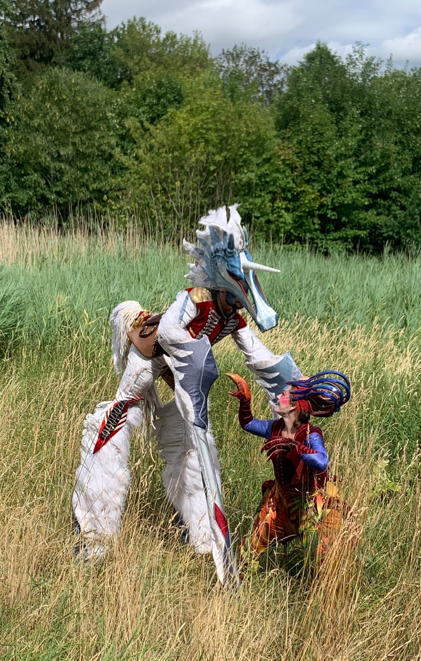 Märchenhaft, das Einhorn verwandelbar in ein Zirkuspferd. Azurro ist eine mystische Pferdefigur, Pferd und Reiter gleichermaßen, galoppiert es dem Publikum entgegen. Ungeduldig wiehernd oder sanft schnuppernd nimmt es Kontakt auf. Manchmal reiten Kinder auf seinem starken Rücken ein Stück mit in eine andere Welt. Wenn es dunkel wird, zeichnen Azurros beleuchtete Mähne und sein Lichtschweif eine wilde Silhouette in den Nachthimmel.
