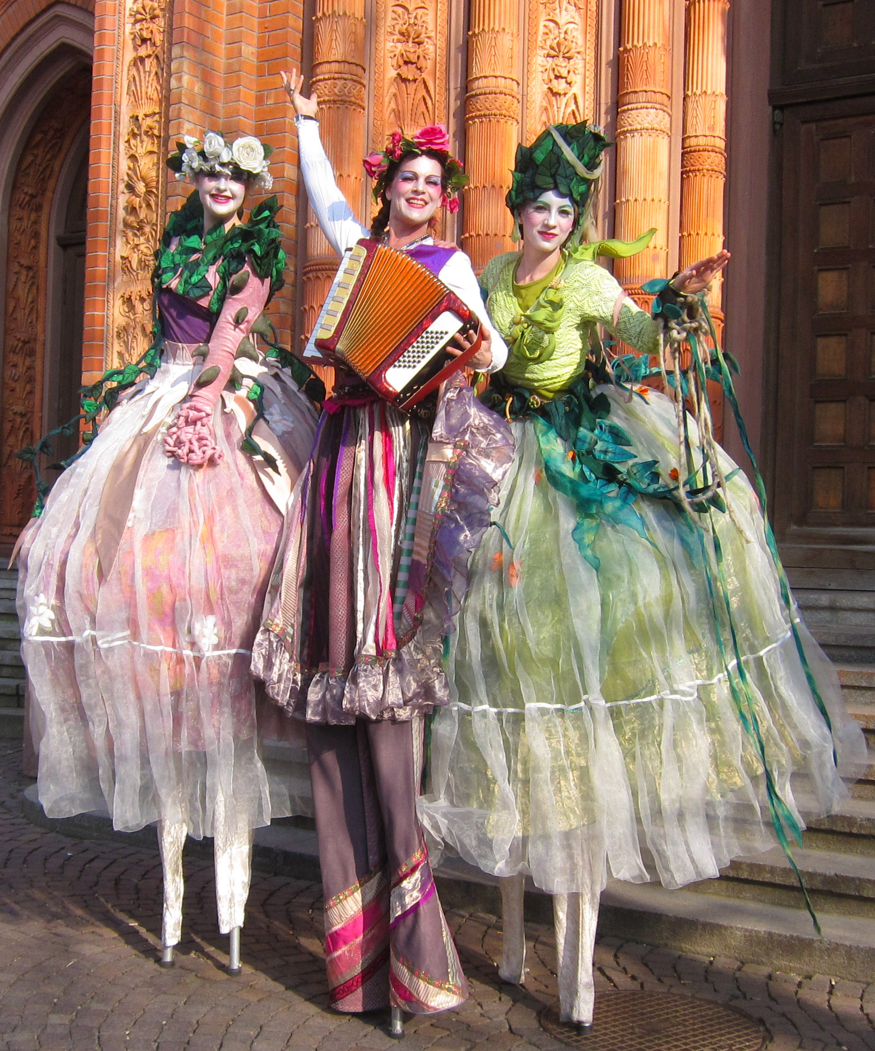 Jungfräulich bringen sie Wärme, Leichtigkeit und Freude in die Städte. Singend, tanzend, mit musikalischer Unterstützung vertreiben sie den Winter und tauen die Herzen der Menschen auf. Blumenranken und Blütenblätter wachsen auf riesigen Reifröcken und verströmen einen erfrischenden Frühlingsduft.