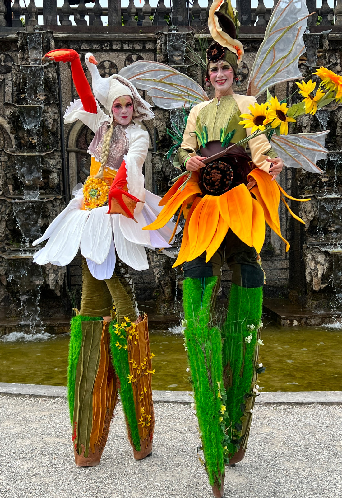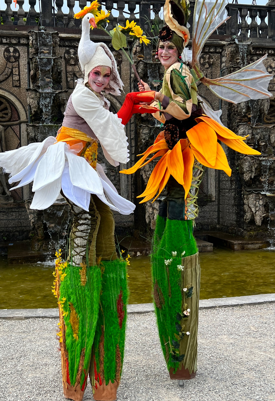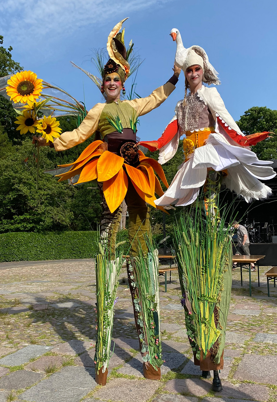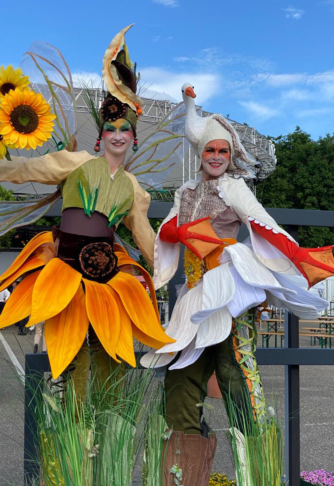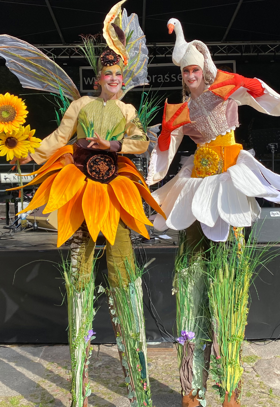 Die Sonnenblume und das Gänseblümchen leben in einer Märchenwelt, wo Elfen und Fabelwesen beheimatet sind. Fest verwurzelt auf ihren mit Gras bewachsenen Stelzen präsentieren sie ihre Blütenpracht. Getragen von Elfenflügeln und Vogelfedern überraschen sie die Gäste, wenn sich unerwartet ein Gänsefuß auf ihren Schultern niederlässt. Lassen sie sich verzaubern!