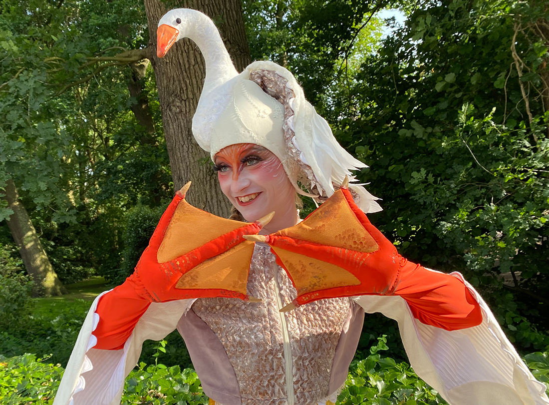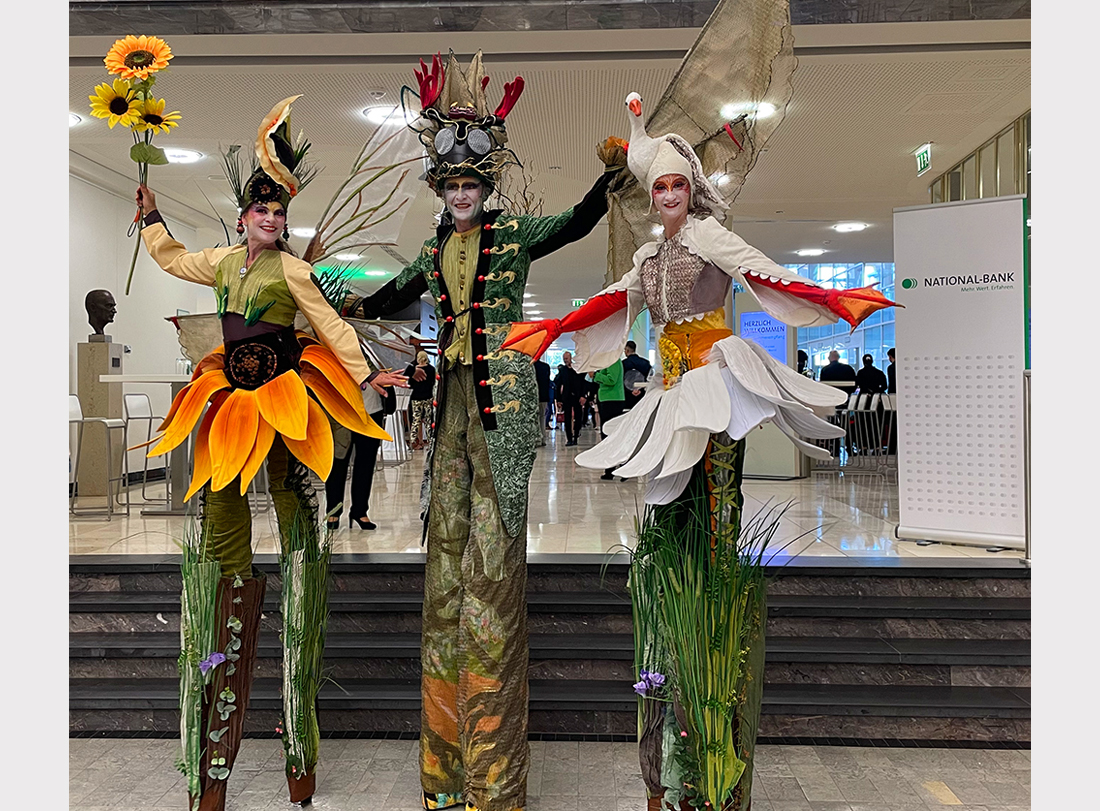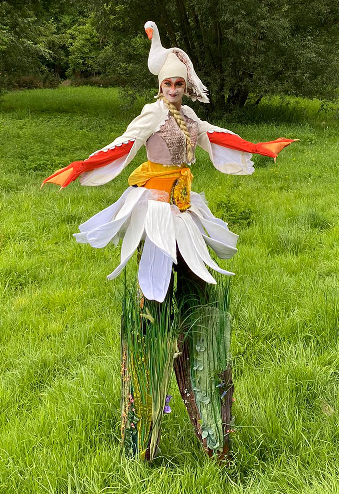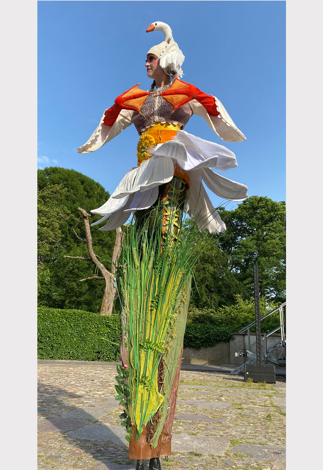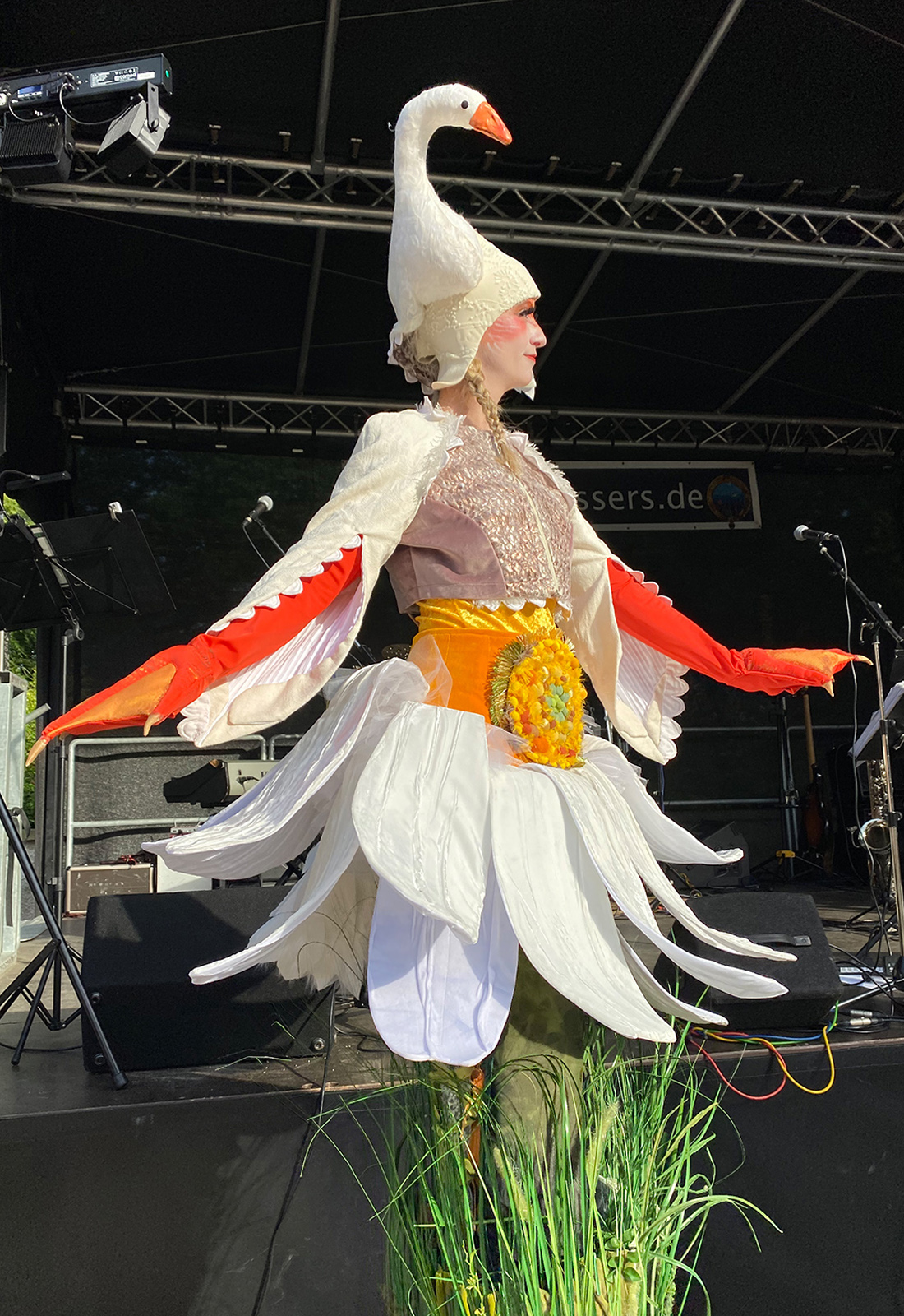 Die Sonnenblume und das Gänseblümchen leben in einer Märchenwelt, wo Elfen und Fabelwesen beheimatet sind. Fest verwurzelt auf ihren mit Gras bewachsenen Stelzen präsentieren sie ihre Blütenpracht. Getragen von Elfenflügeln und Vogelfedern überraschen sie die Gäste, wenn sich unerwartet ein Gänsefuß auf ihren Schultern niederlässt. Lassen sie sich verzaubern!