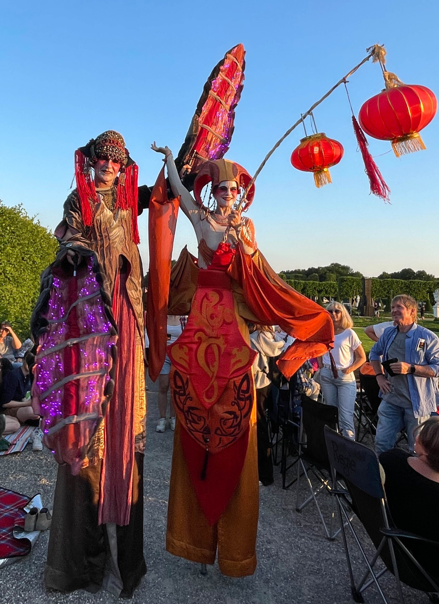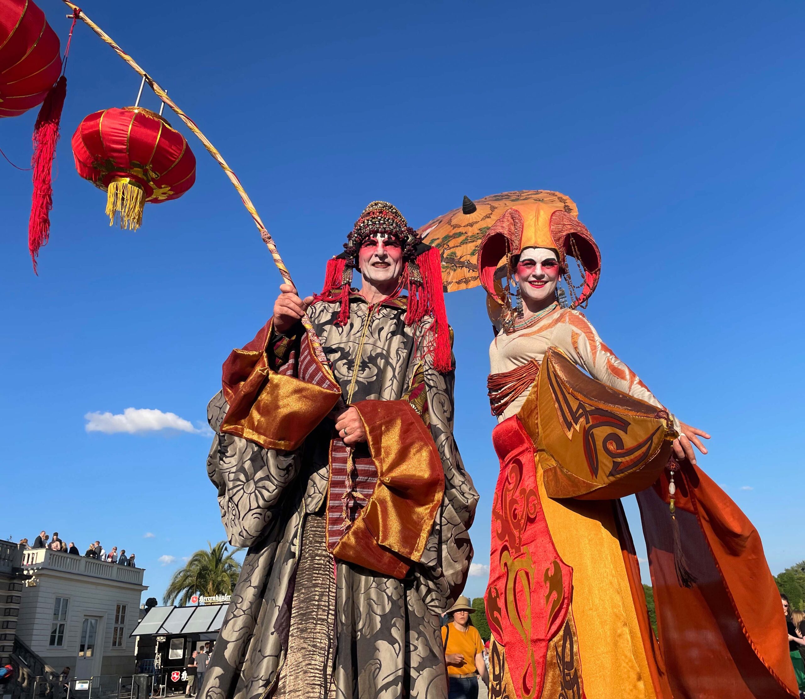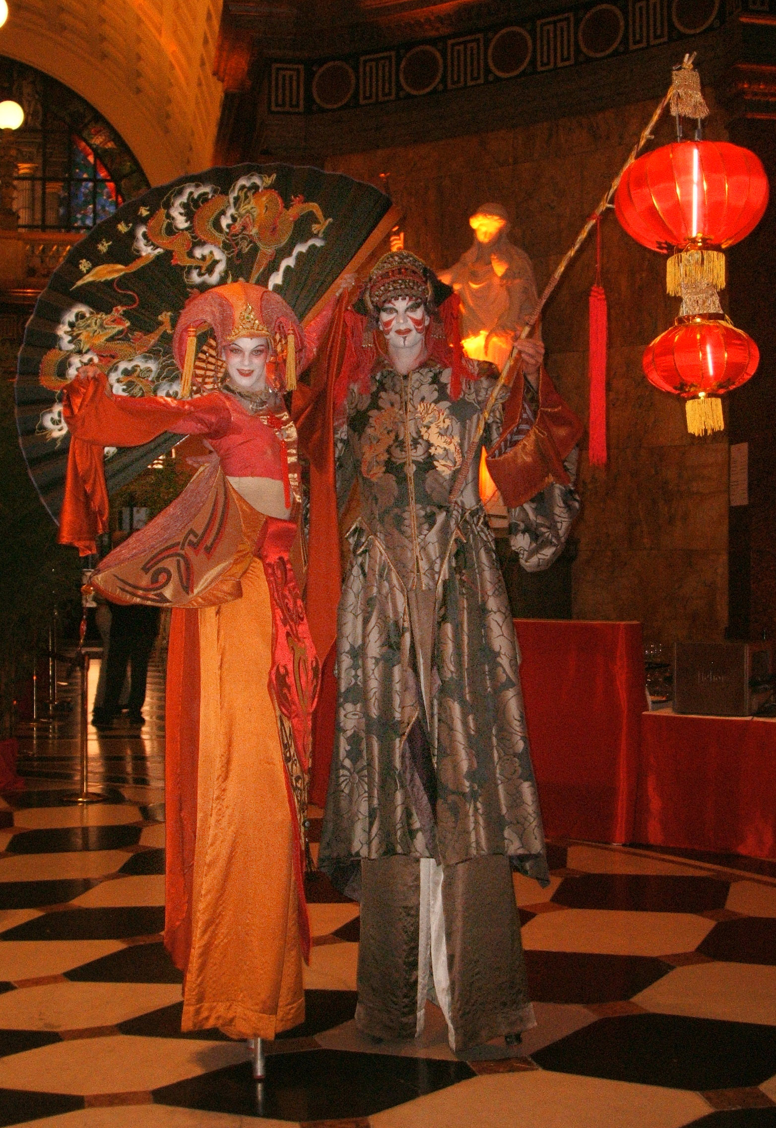 Sind Göttinnen und Götter, die aus Asien zu uns kommen. Sie tragen majestätische, reich geschmückte Gewänder, bestickt mit Perlen und Ornamenten. Mit erzählenden Gesten schreiten sie durch das Publikum. Der Segen des Ostens erfüllt ihre Umgebung. Ob China, Indien oder Ägypten, sie sind in diesen Ländern anwesend in ihrer bezaubernden fernöstlichen Präsenz. Als Maskenträger sind sie auch beim Karneval in Venedig zu finden.