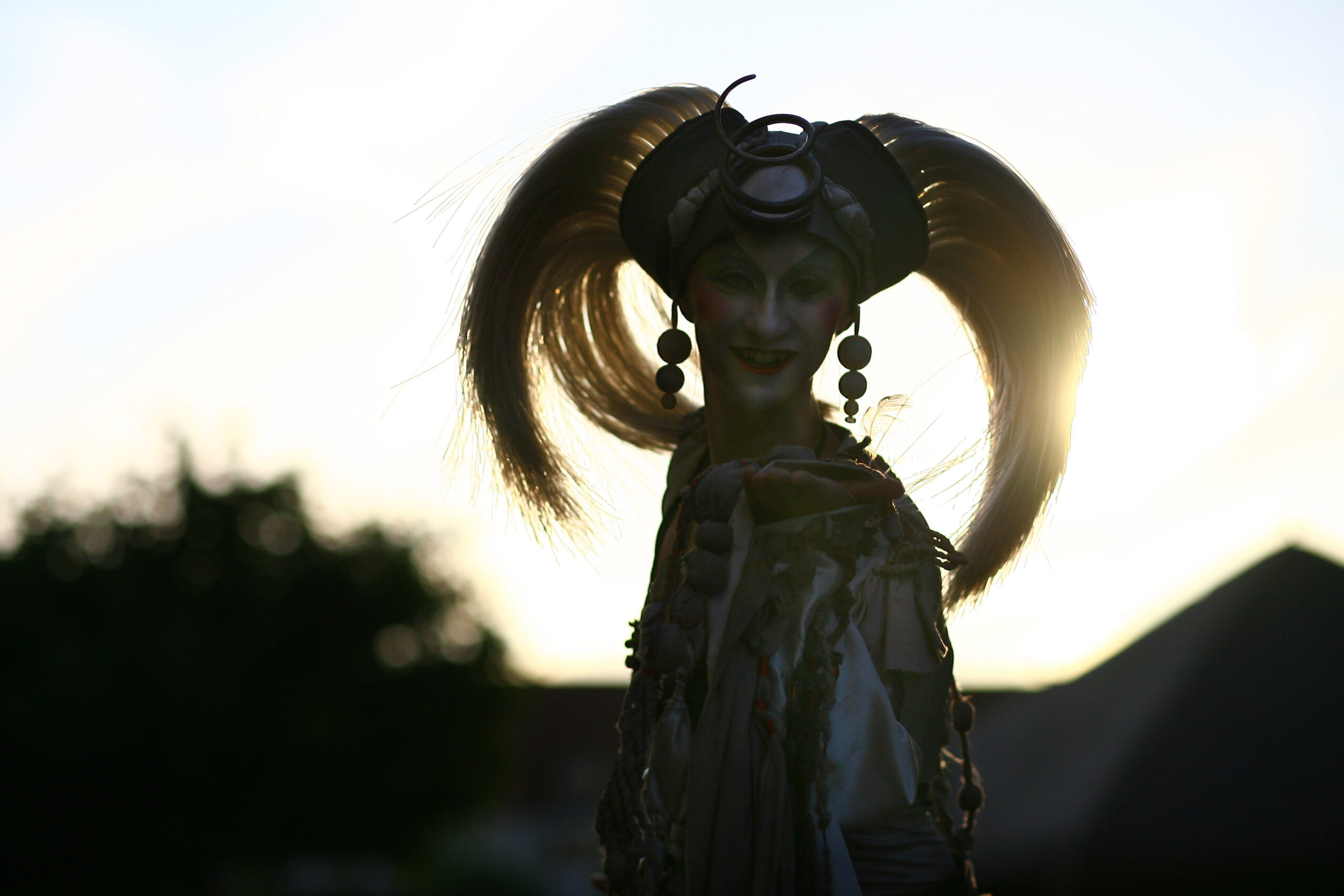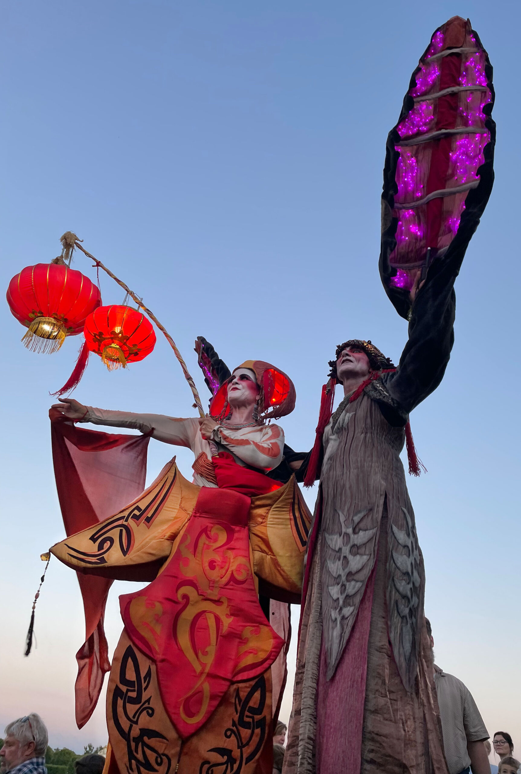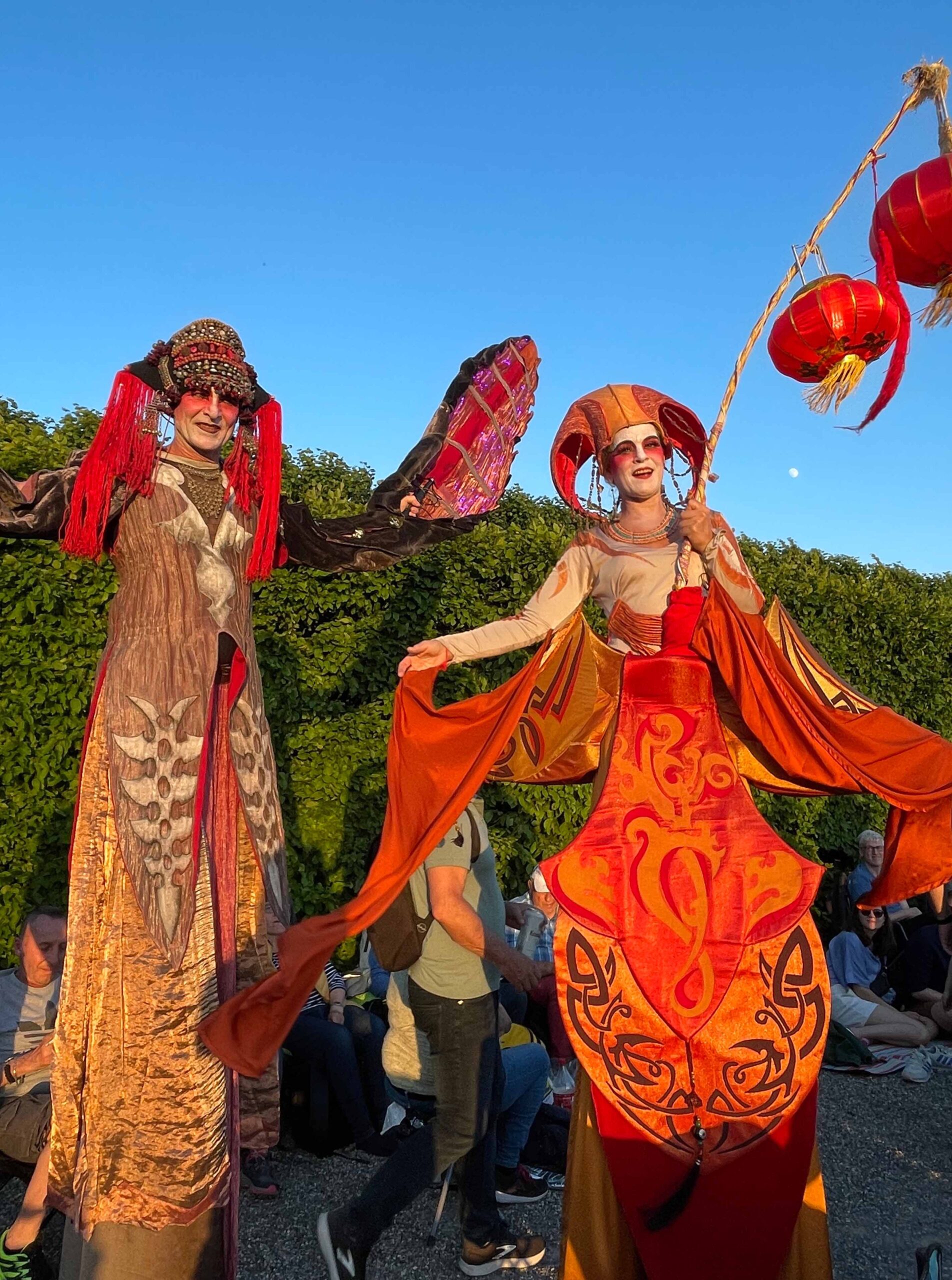 Sind Göttinnen und Götter, die aus Asien zu uns kommen. Sie tragen majestätische, reich geschmückte Gewänder, bestickt mit Perlen und Ornamenten. Mit erzählenden Gesten schreiten sie durch das Publikum. Der Segen des Ostens erfüllt ihre Umgebung. Ob China, Indien oder Ägypten, sie sind in diesen Ländern anwesend in ihrer bezaubernden fernöstlichen Präsenz. Als Maskenträger sind sie auch beim Karneval in Venedig zu finden.