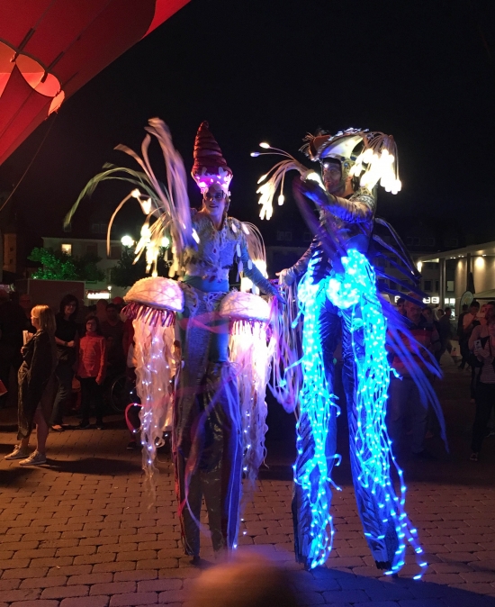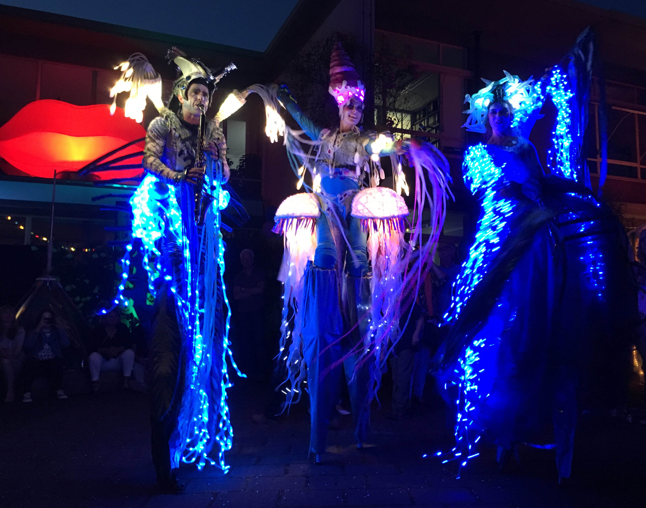 Octoron: ein Fisch im Korallenriff. Die Artenvielfalt der Riffe sind die größten von Lebewesen geschaffenen Strukturen der Erde. Seine Oberfläche ähnelt dieser Riffstruktur im Meer. Bunte Korallen, schuppig und glitzernd schmücken seinen Körper. Octorons Wirbelsäule, ein freigelegtes Fischgräten-Skelett, unterstützt seine hochgewachsene, männliche Gestalt. Er verkörpert den Reichtum des Meeres.