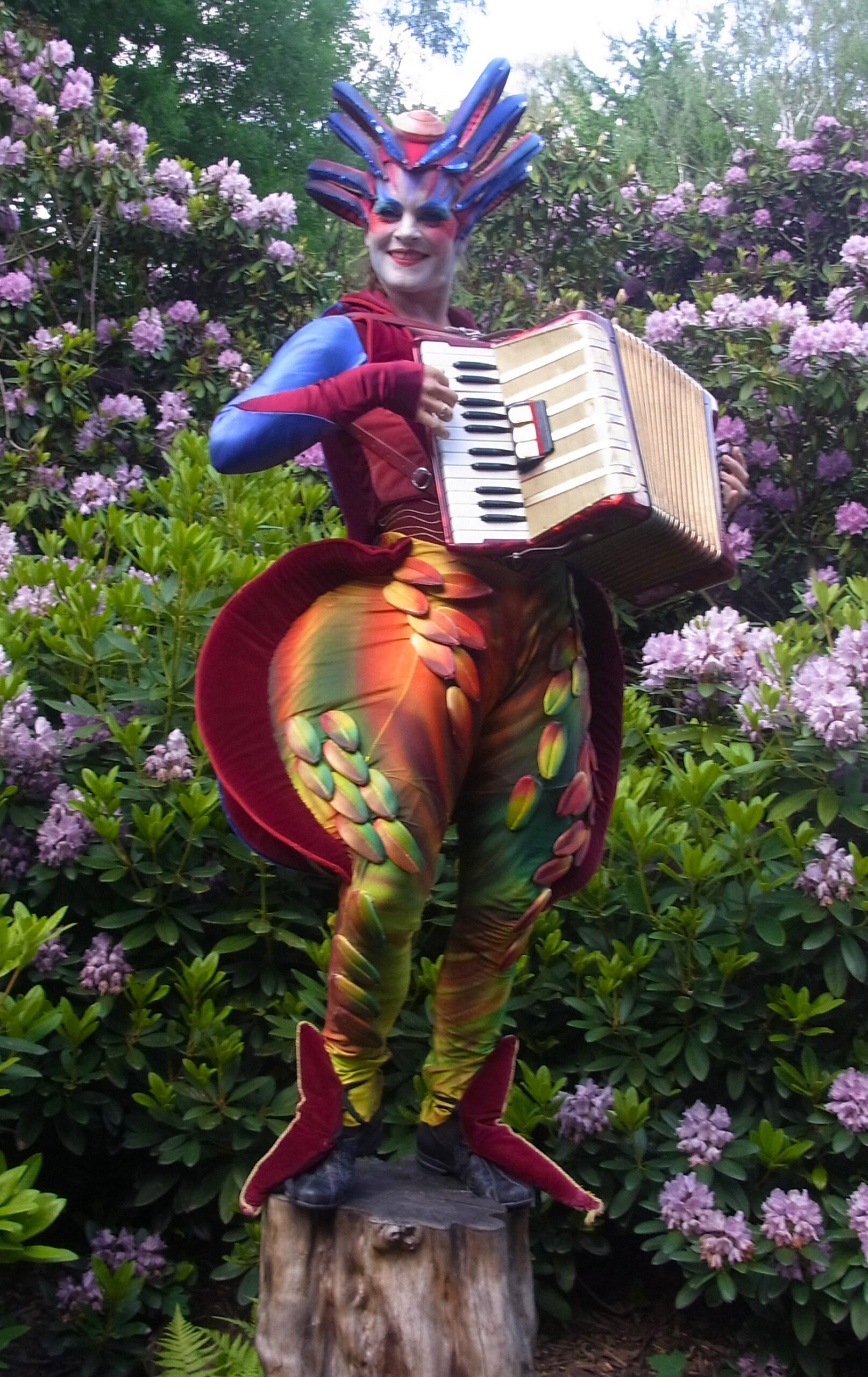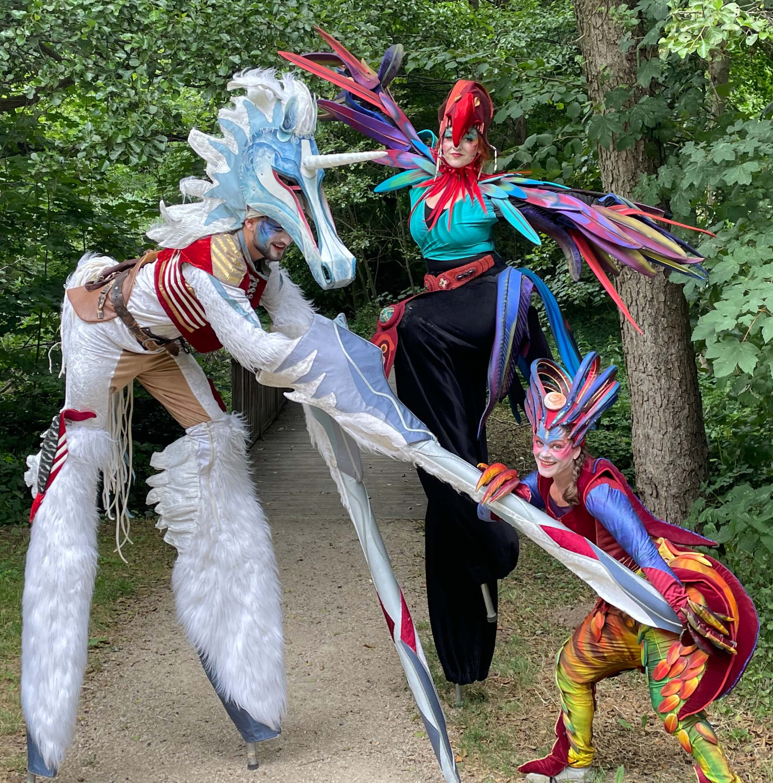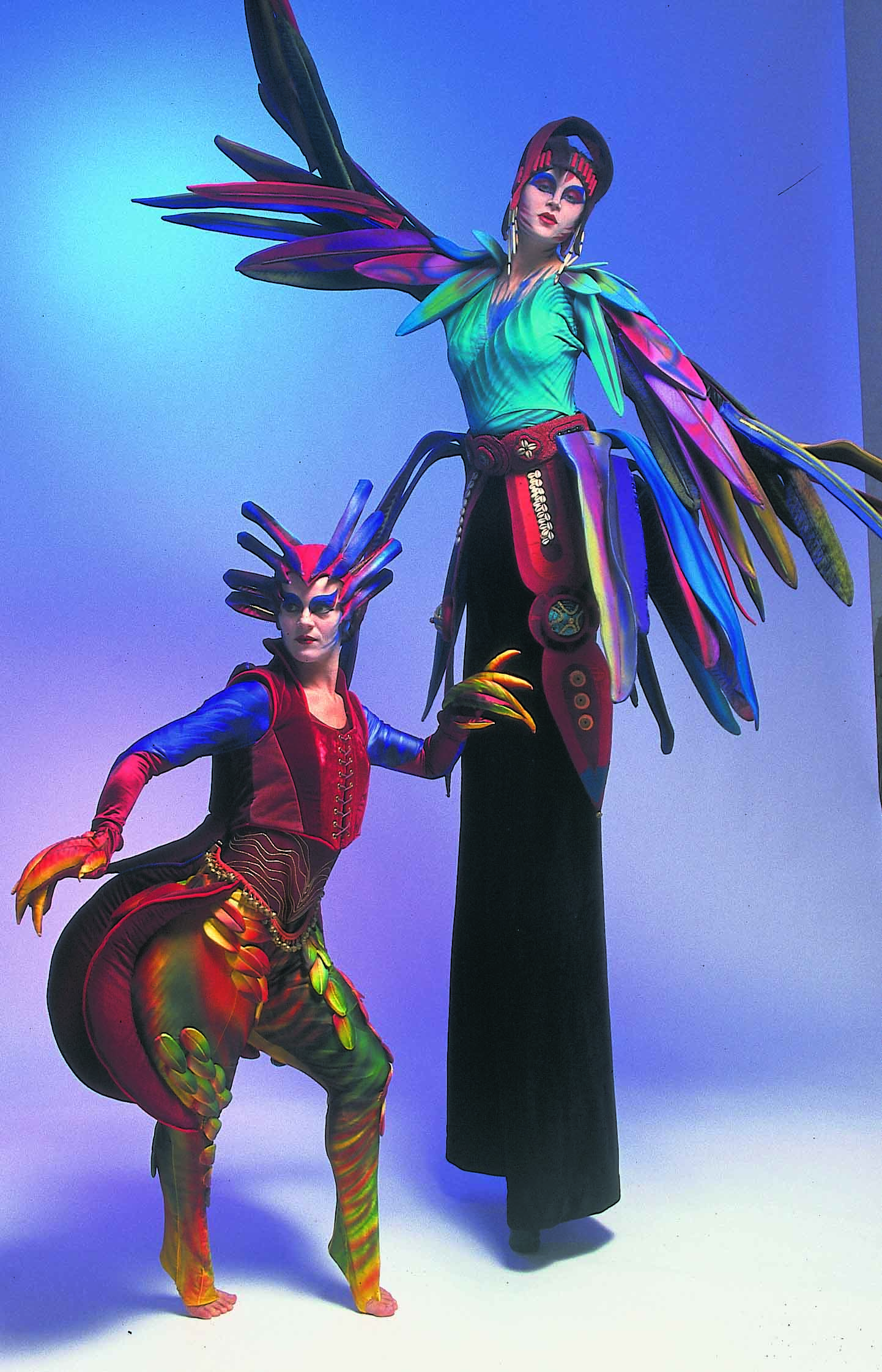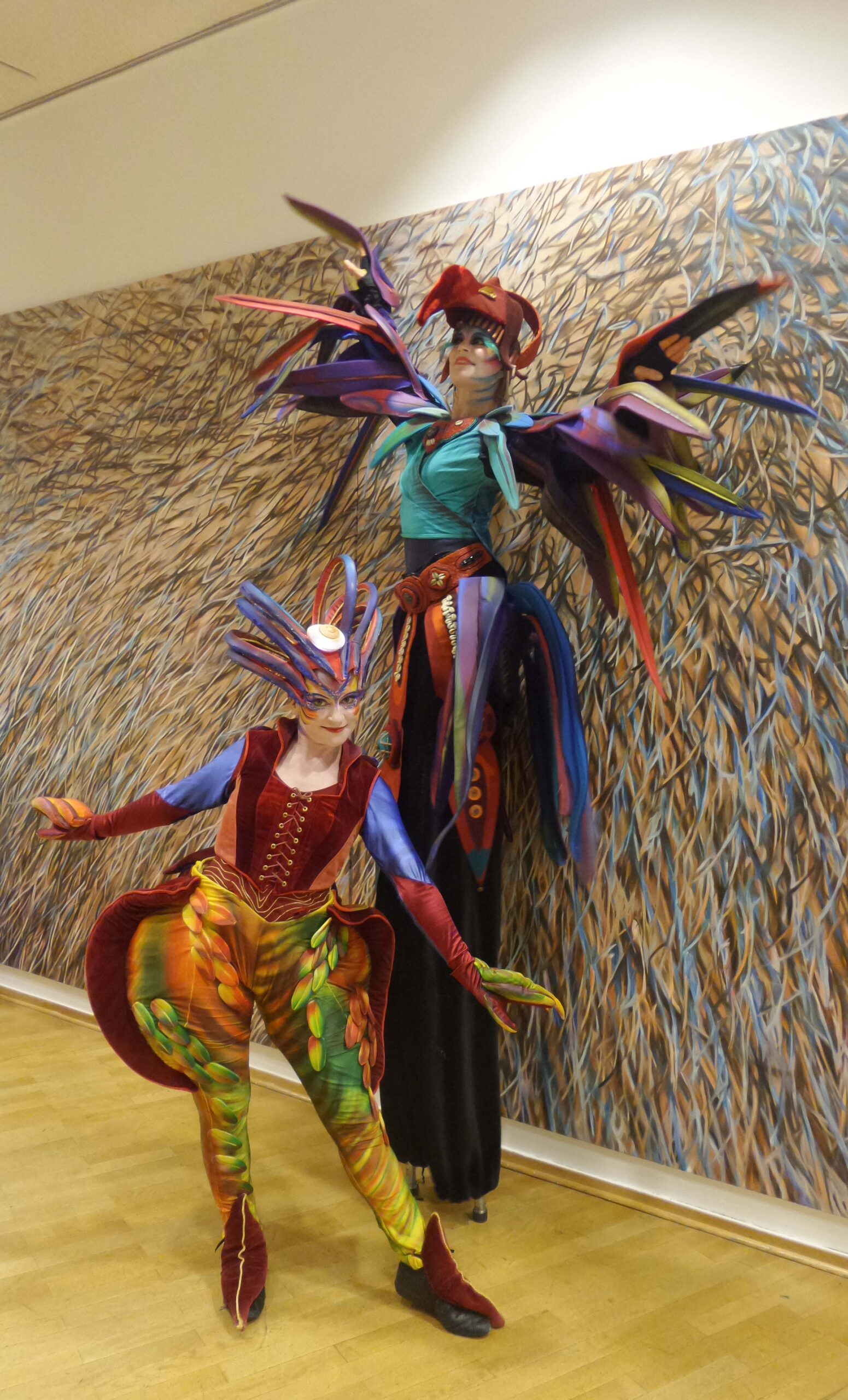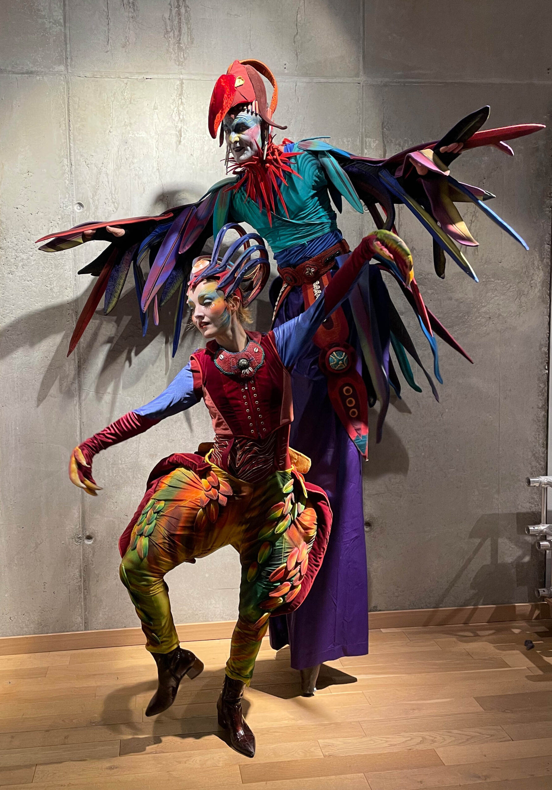 Sie scheinen dem Djungel entflohen. Zwei exotische Paradiesvögel mit sehr unterschiedlichem Charakter. Tucano, langgefiedert, luftig und stolz, neben dem erdnahen, kurzbeinigen Jungvogel Piupiu. Sie sind in Tier- und Palmengärten zu Hause. Sie bezaubern durch ihr schillerndes Gefieder und groteske Bewegungen in ihren kunstvoll gearbeiteten Kostümen.