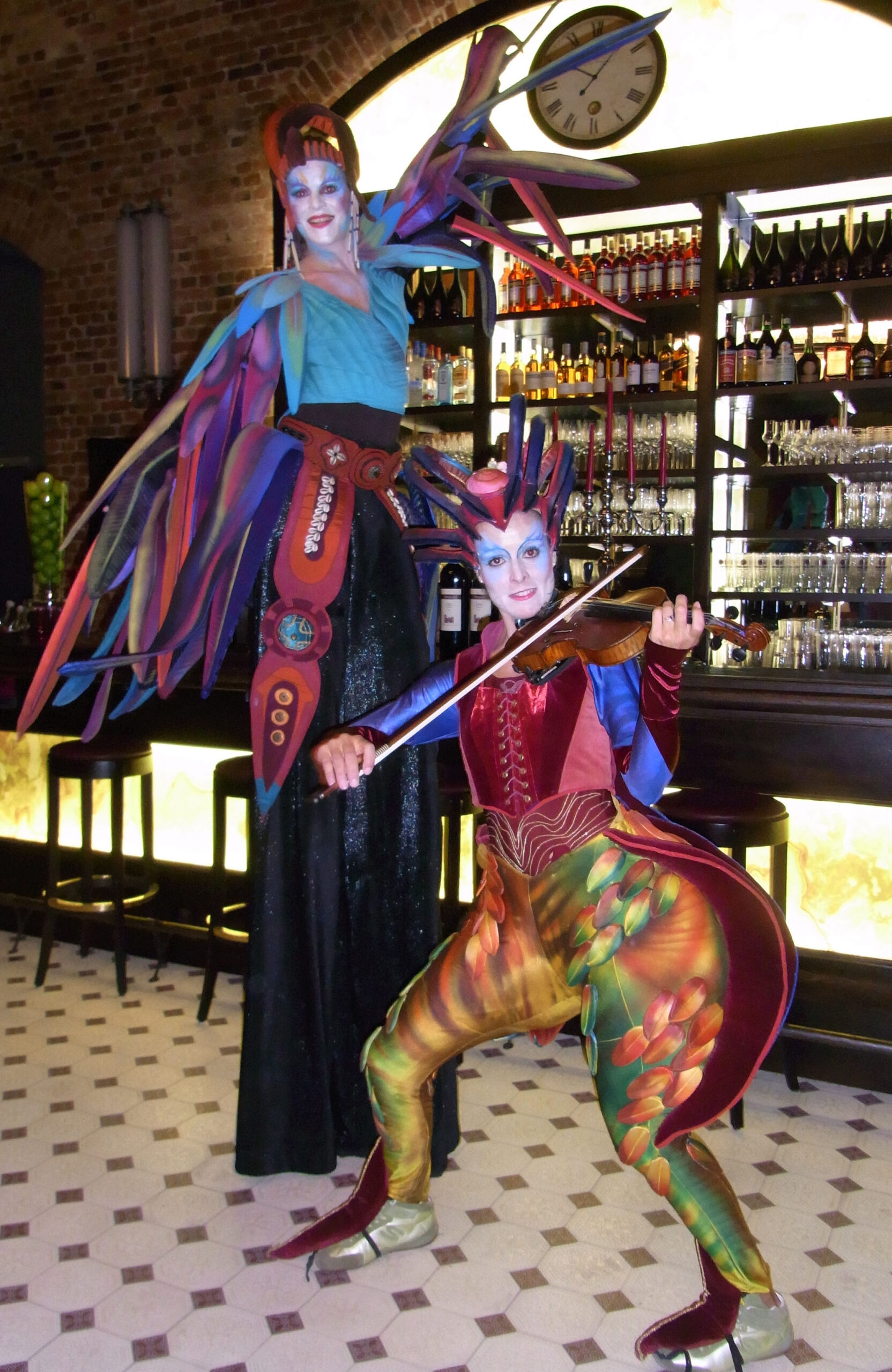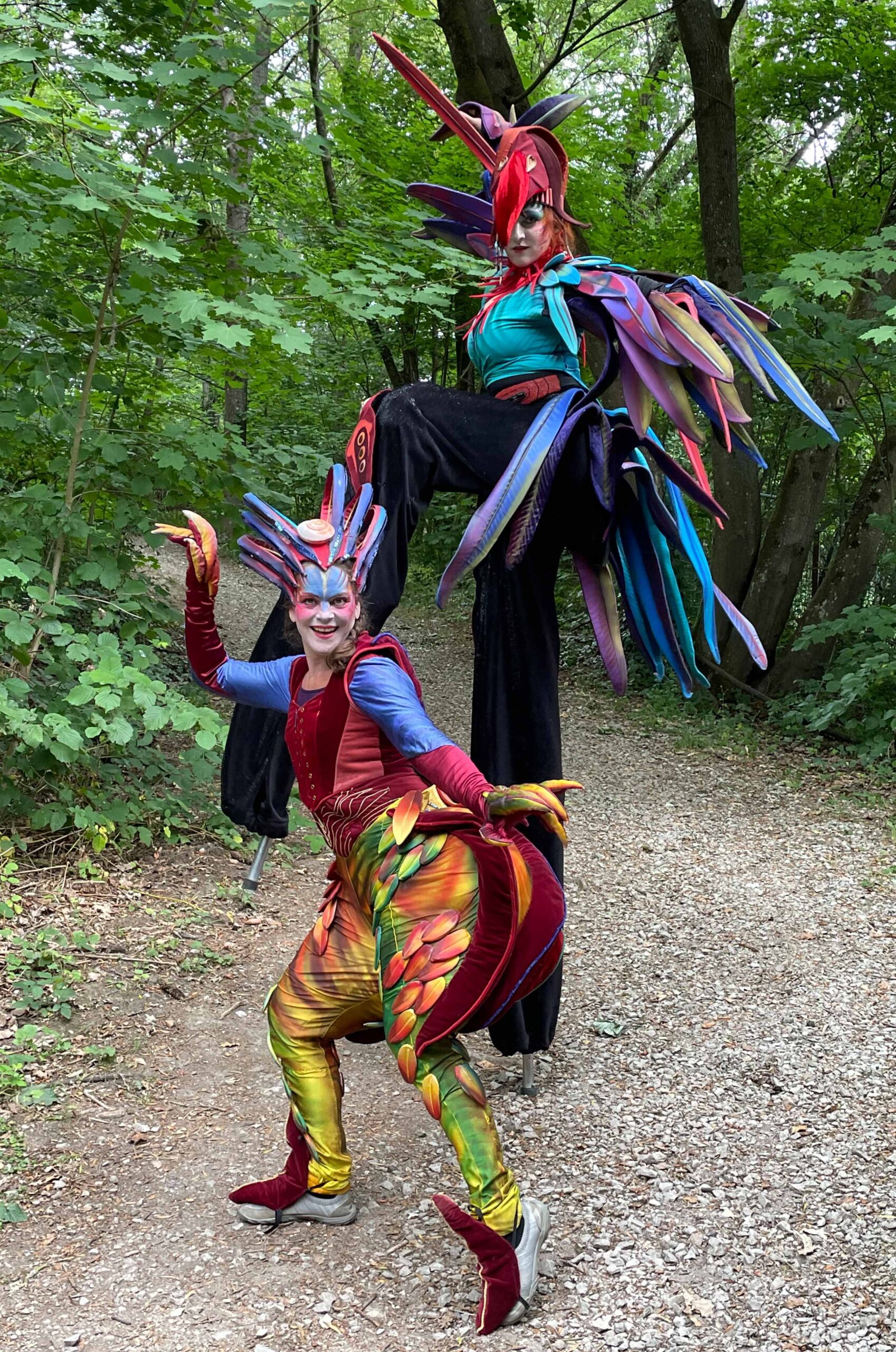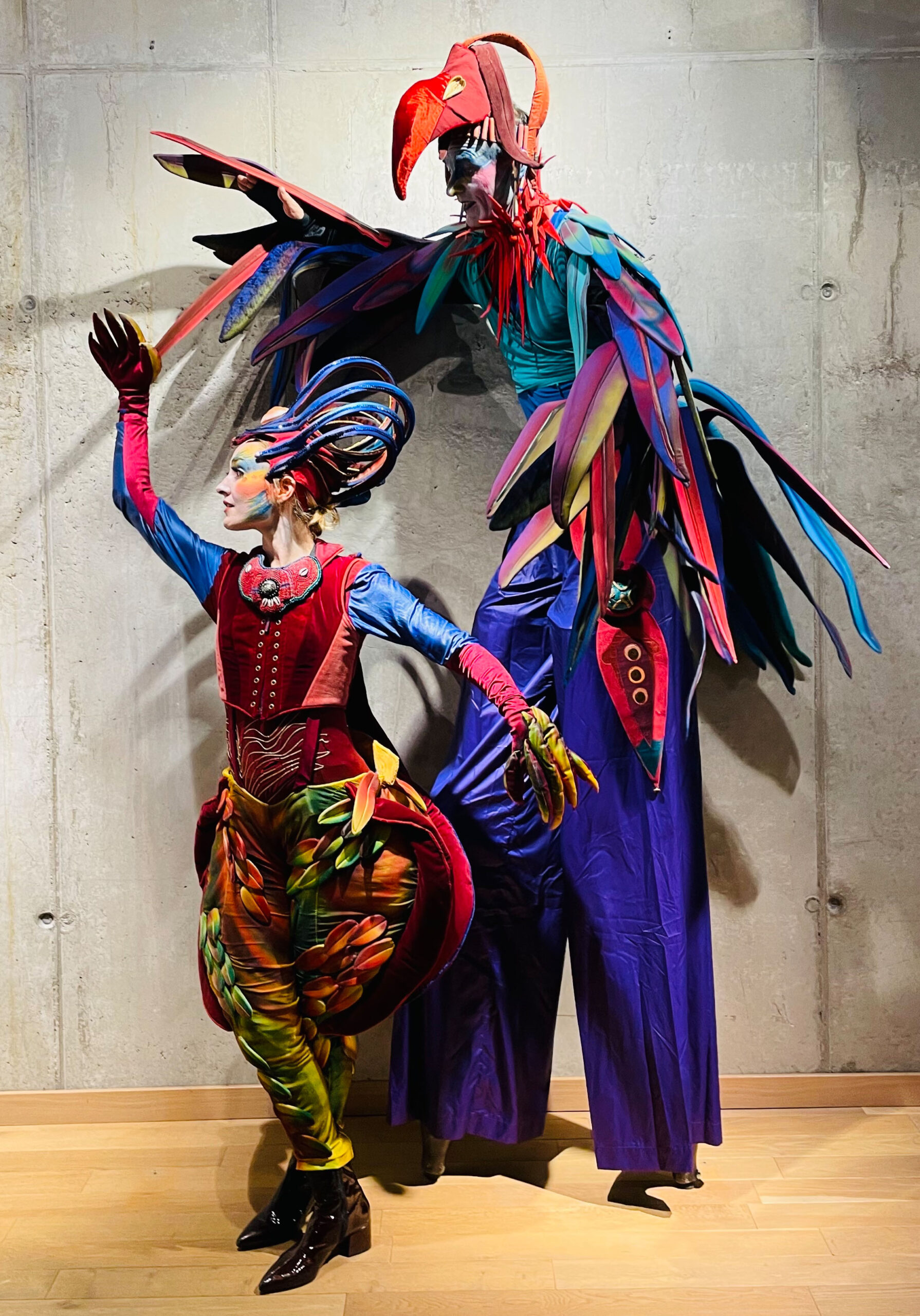 Sie scheinen dem Djungel entflohen. Zwei exotische Paradiesvögel mit sehr unterschiedlichem Charakter. Tucano, langgefiedert, luftig und stolz, neben dem erdnahen, kurzbeinigen Jungvogel Piupiu. Sie sind in Tier- und Palmengärten zu Hause. Sie bezaubern durch ihr schillerndes Gefieder und groteske Bewegungen in ihren kunstvoll gearbeiteten Kostümen.