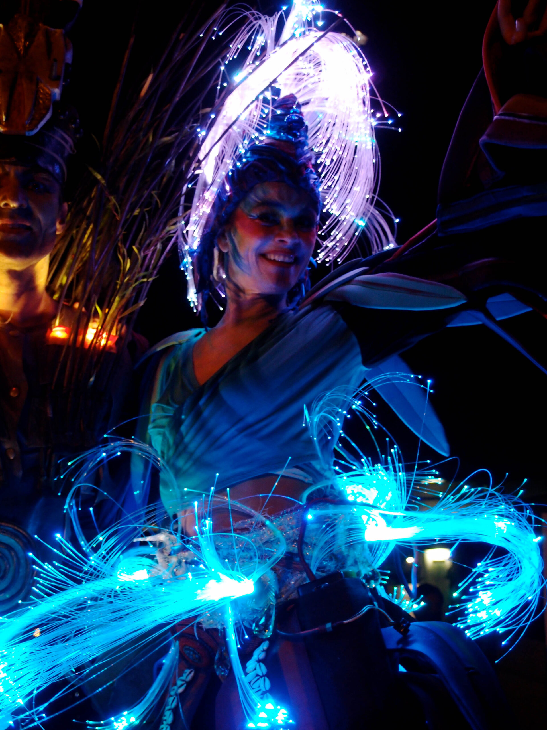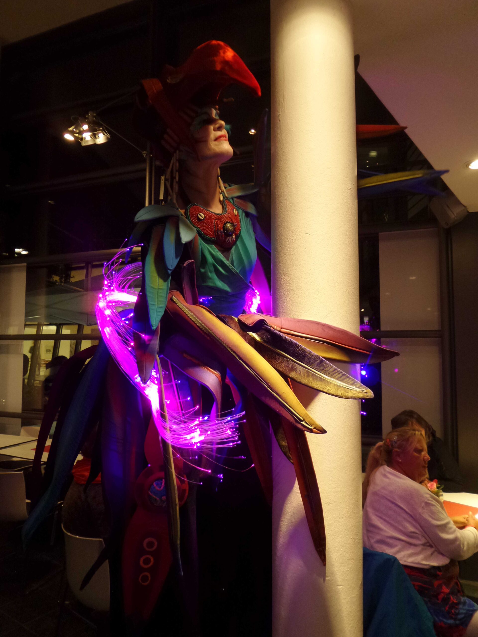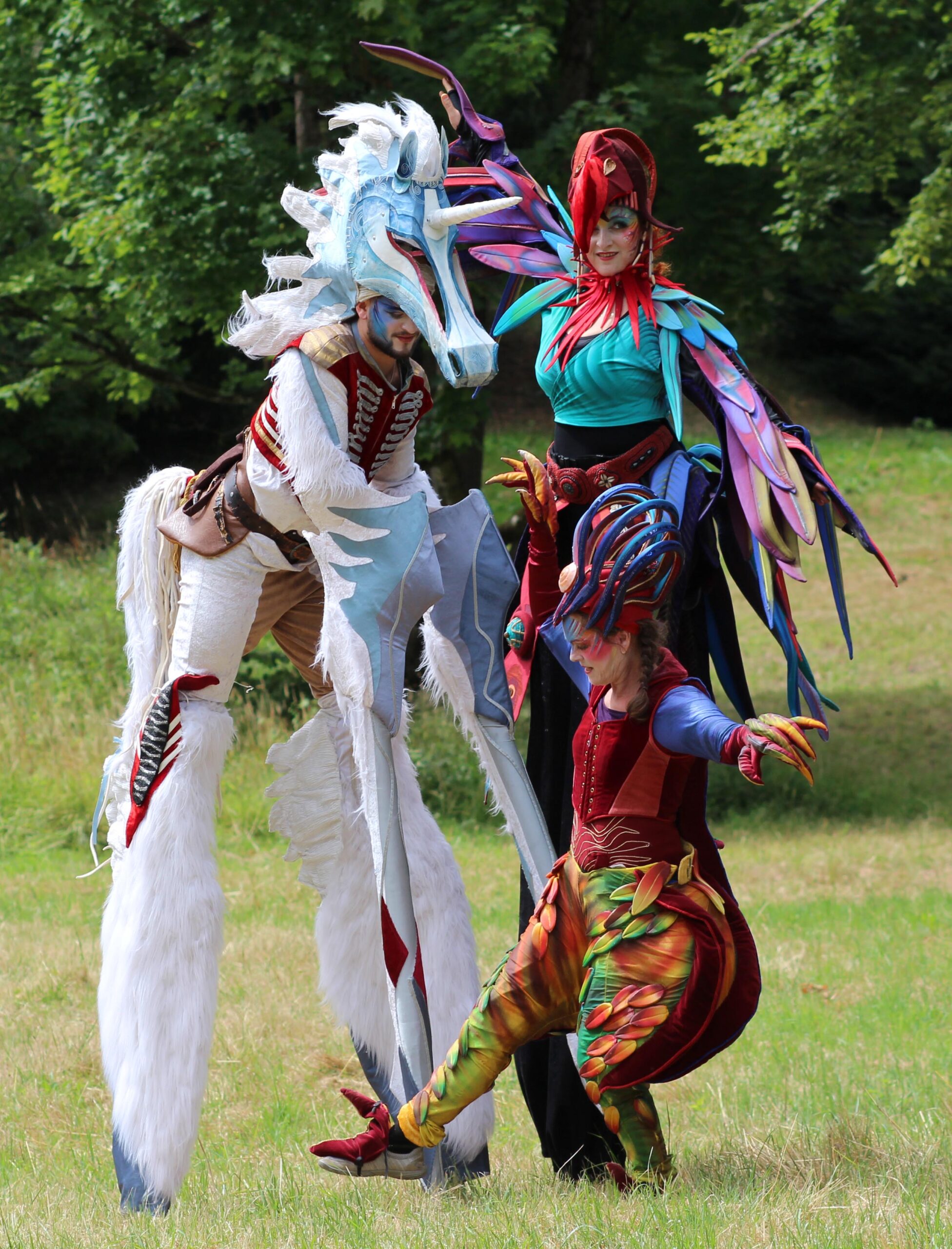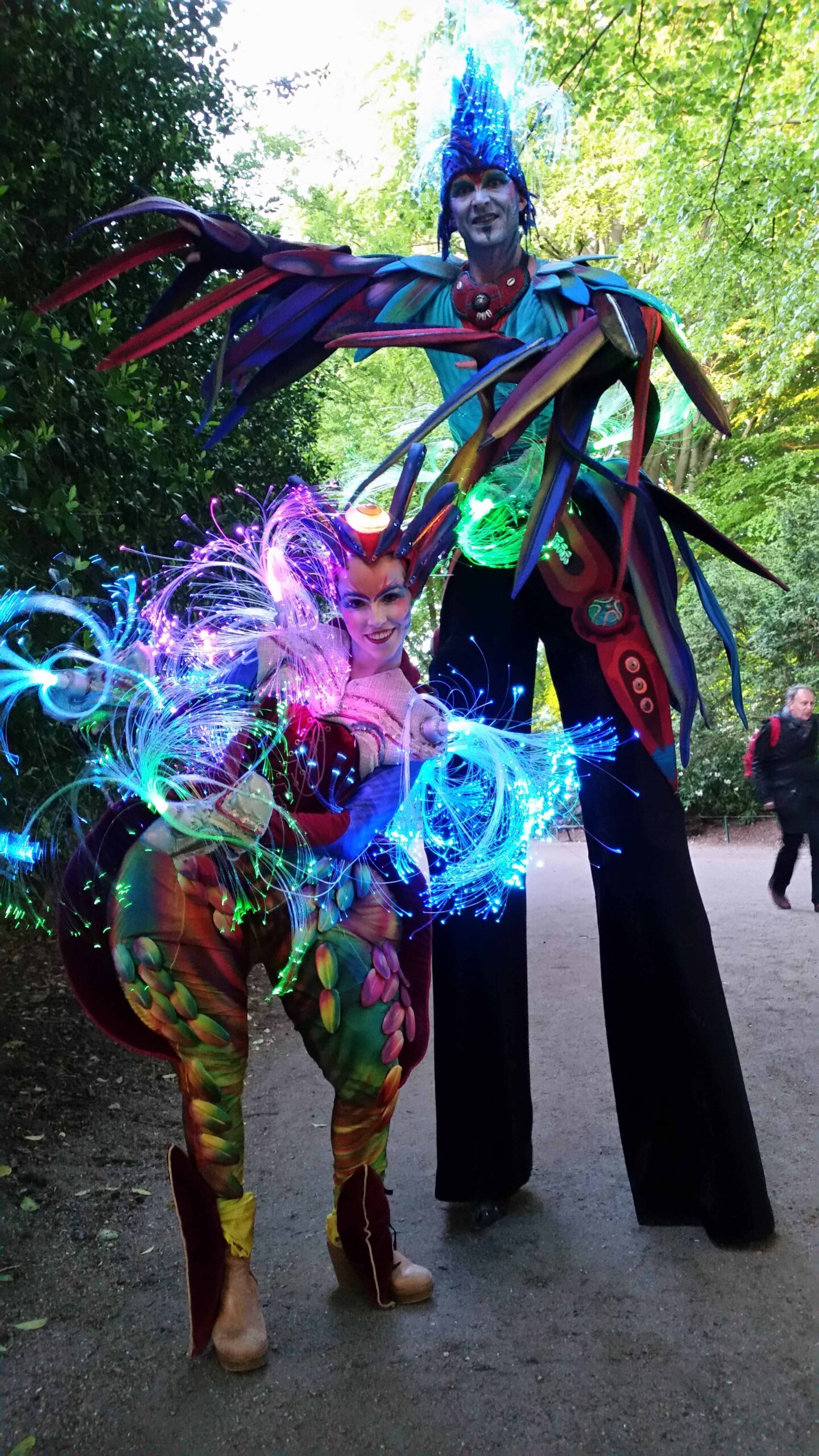 Sie scheinen dem Djungel entflohen. Zwei exotische Paradiesvögel mit sehr unterschiedlichem Charakter. Tucano, langgefiedert, luftig und stolz, neben dem erdnahen, kurzbeinigen Jungvogel Piupiu. Sie sind in Tier- und Palmengärten zu Hause. Sie bezaubern durch ihr schillerndes Gefieder und groteske Bewegungen in ihren kunstvoll gearbeiteten Kostümen.