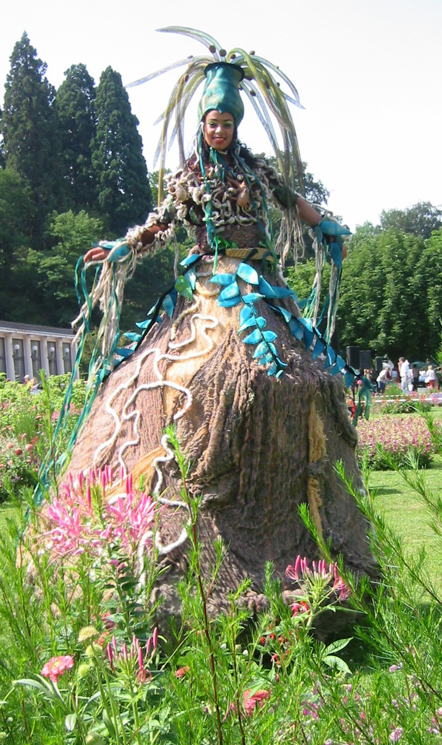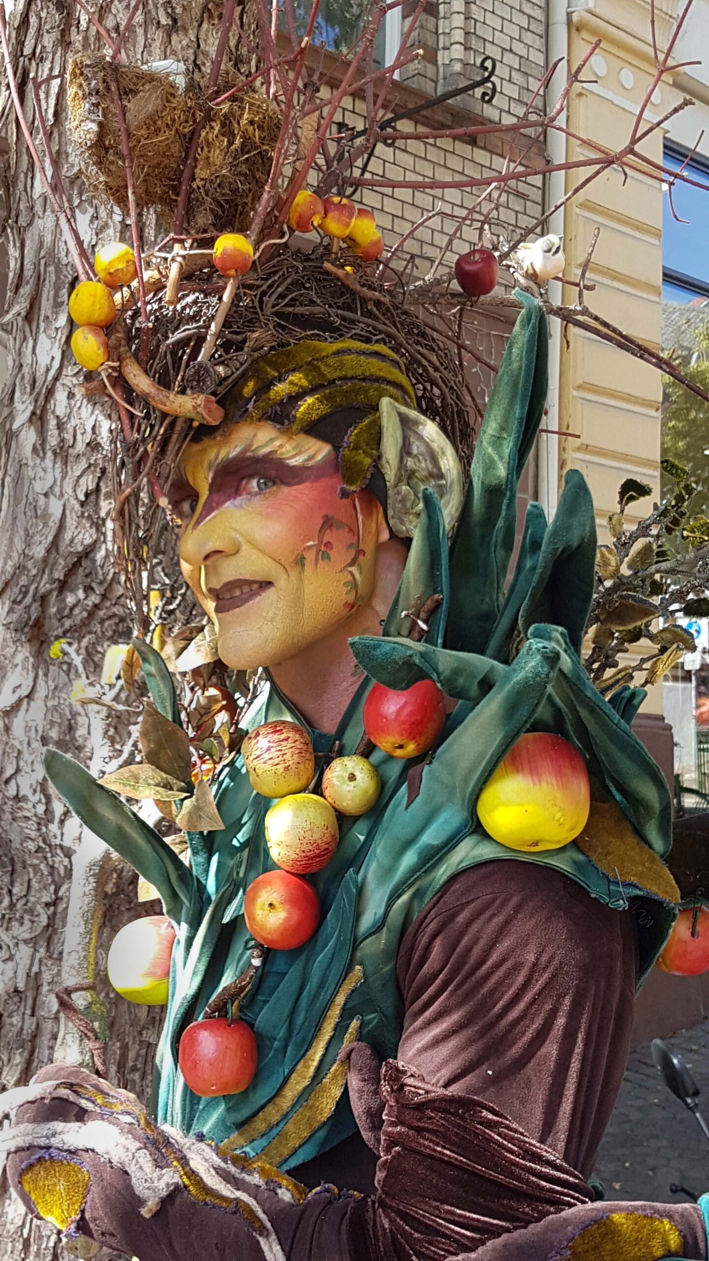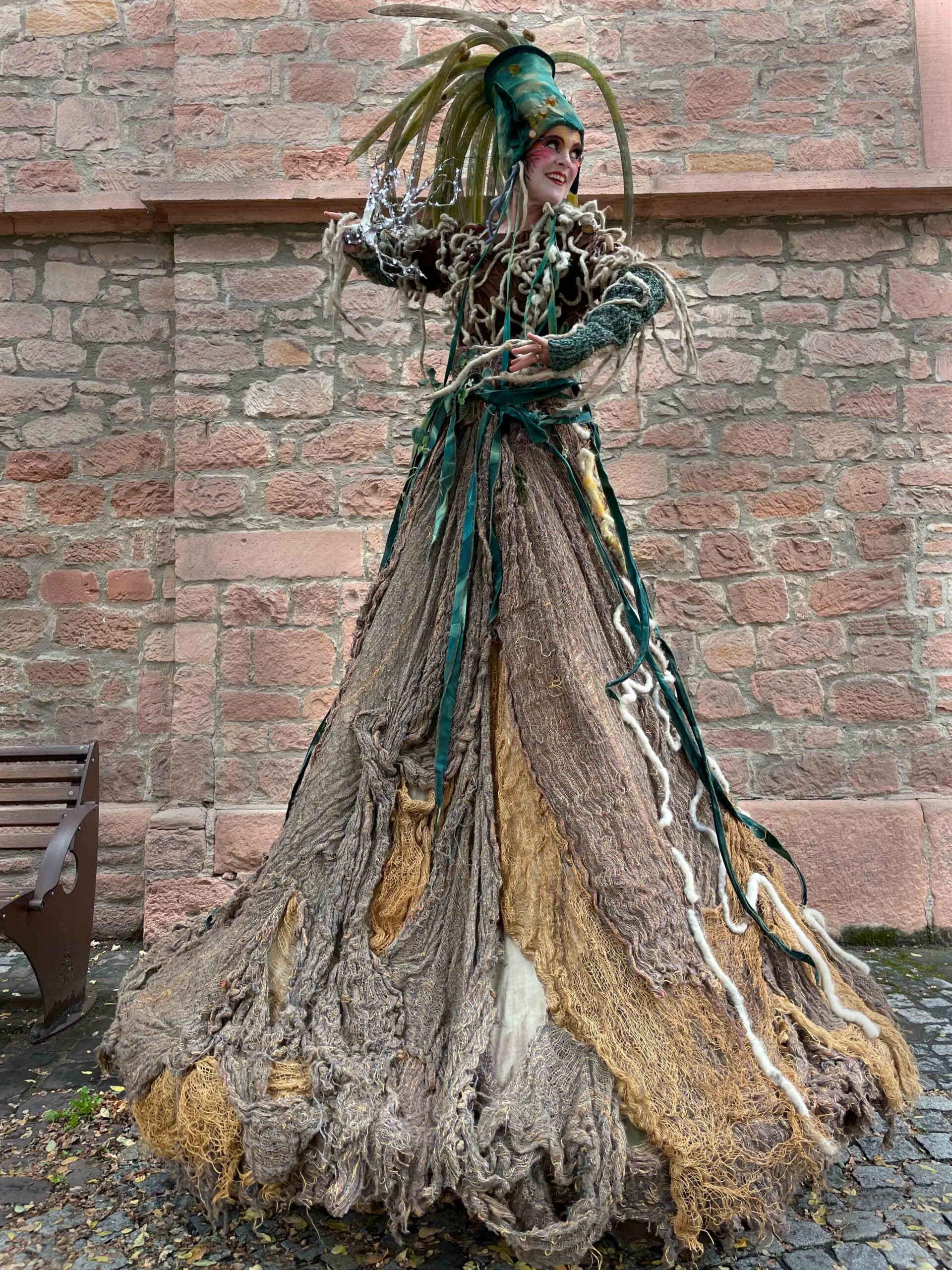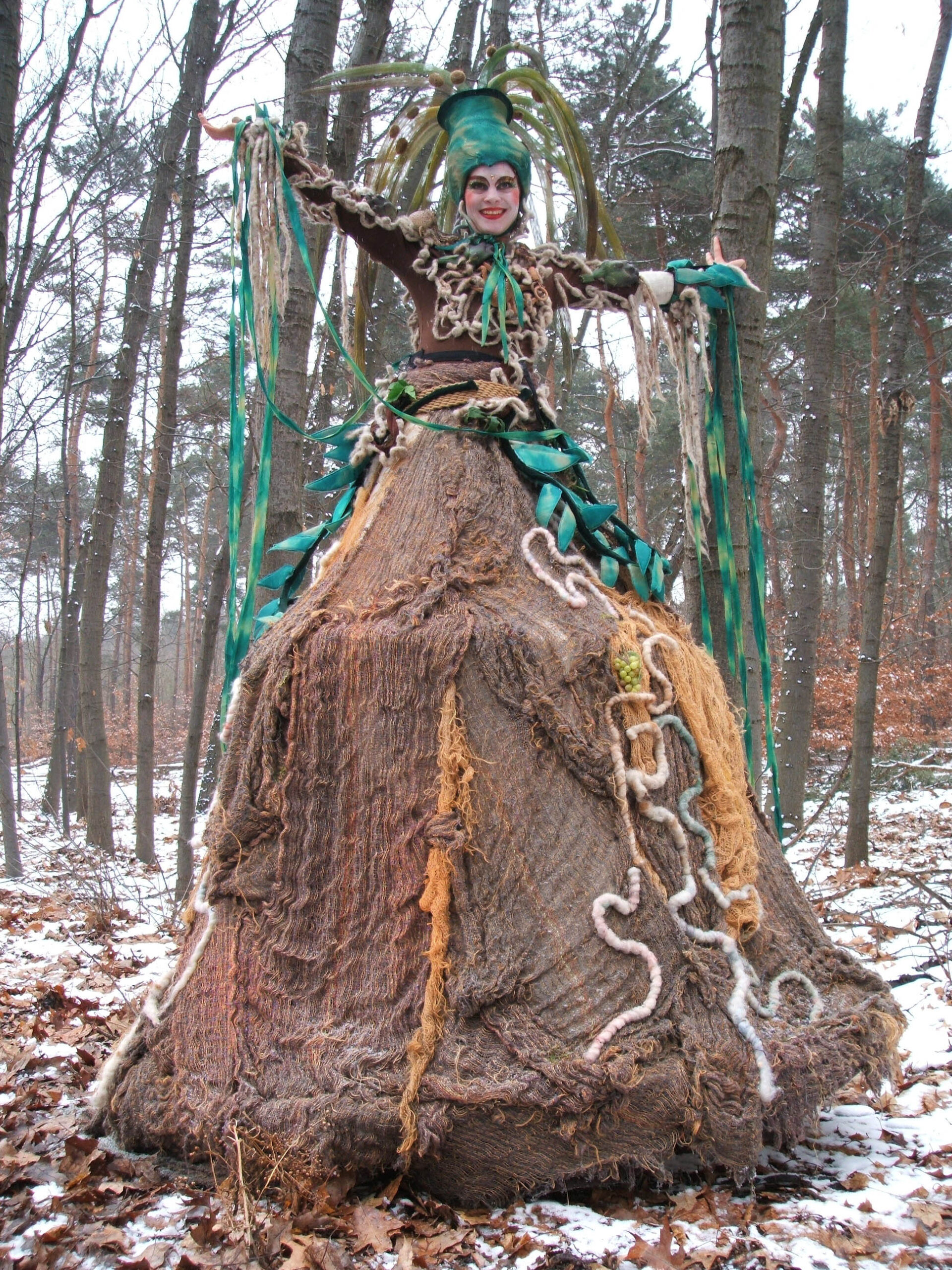 Titania ist mächtig, erdig, und wird umschlungen von Lianen, duftend nach Moos. Luftwurzeln suchen sich ihren Weg. Der Blick des Betrachters verirrt sich in ihrem Kleid ob dieser unzähligen Details, die es zu entdecken gibt. Ein Sommernachtsmärchenwald ist ihr Zuhause. Oberon, ein Baum, der Früchte aller Art trägt. Ein Apfelbaum, den starke Wurzeln verankern und dem Stelzen Halt geben. Er steht für alles Pflanzliche, die Jahreszeiten und ein gutes, ertragreiches Erntedankfest.