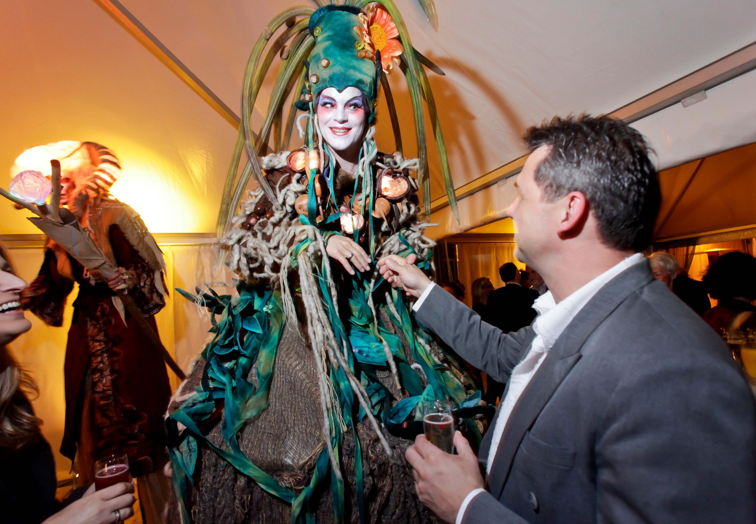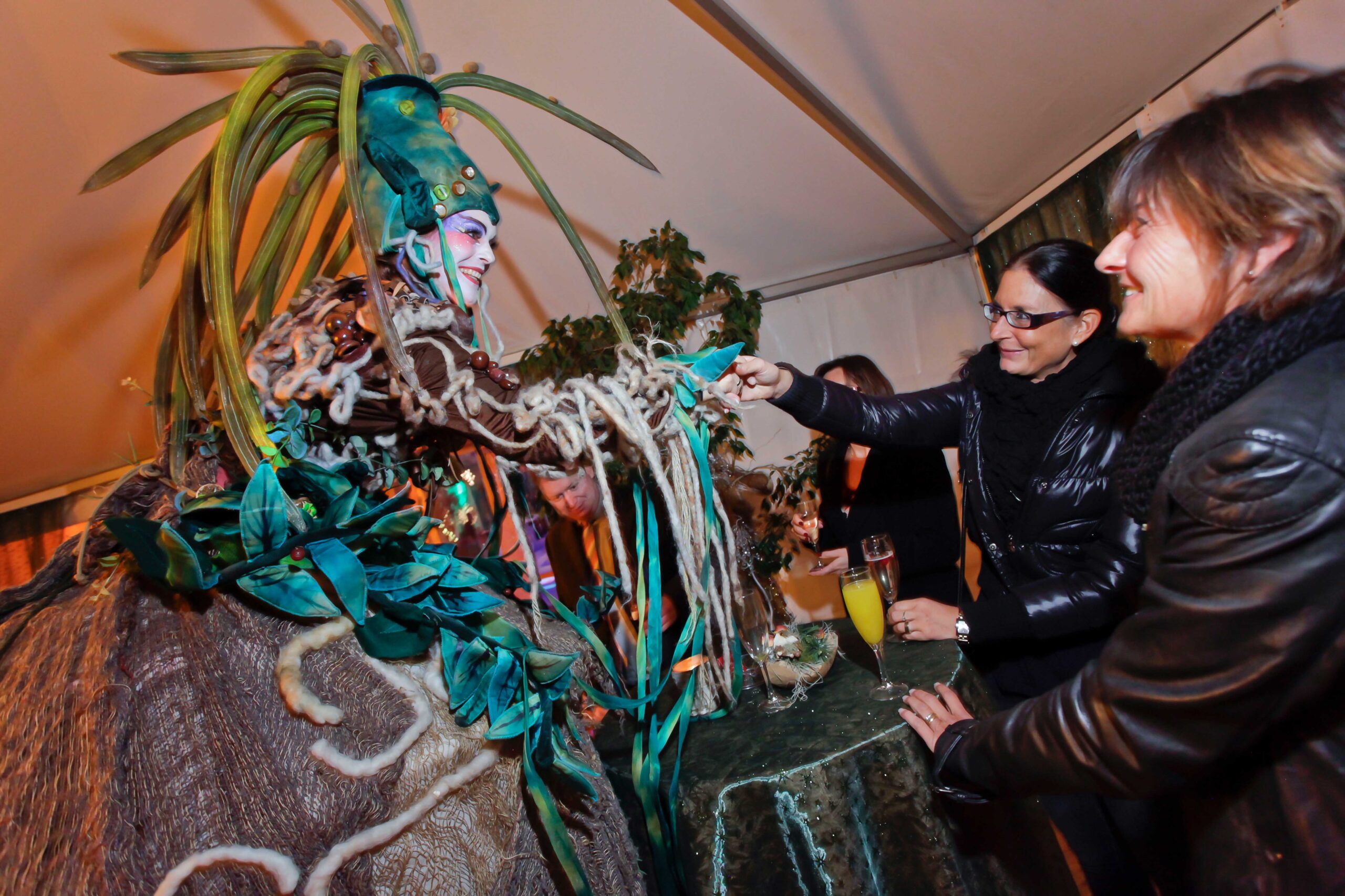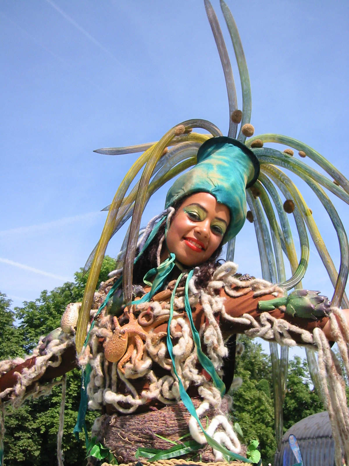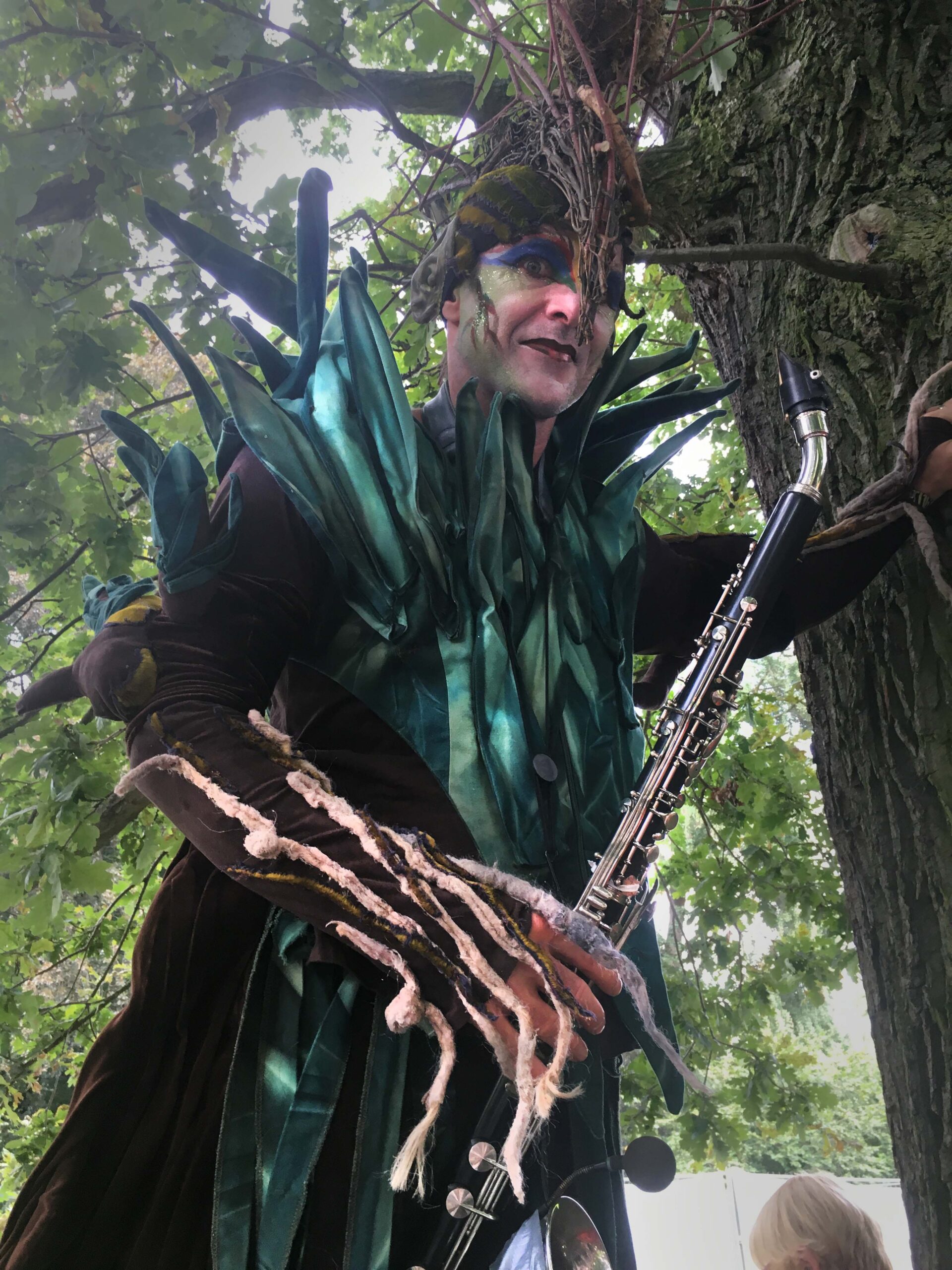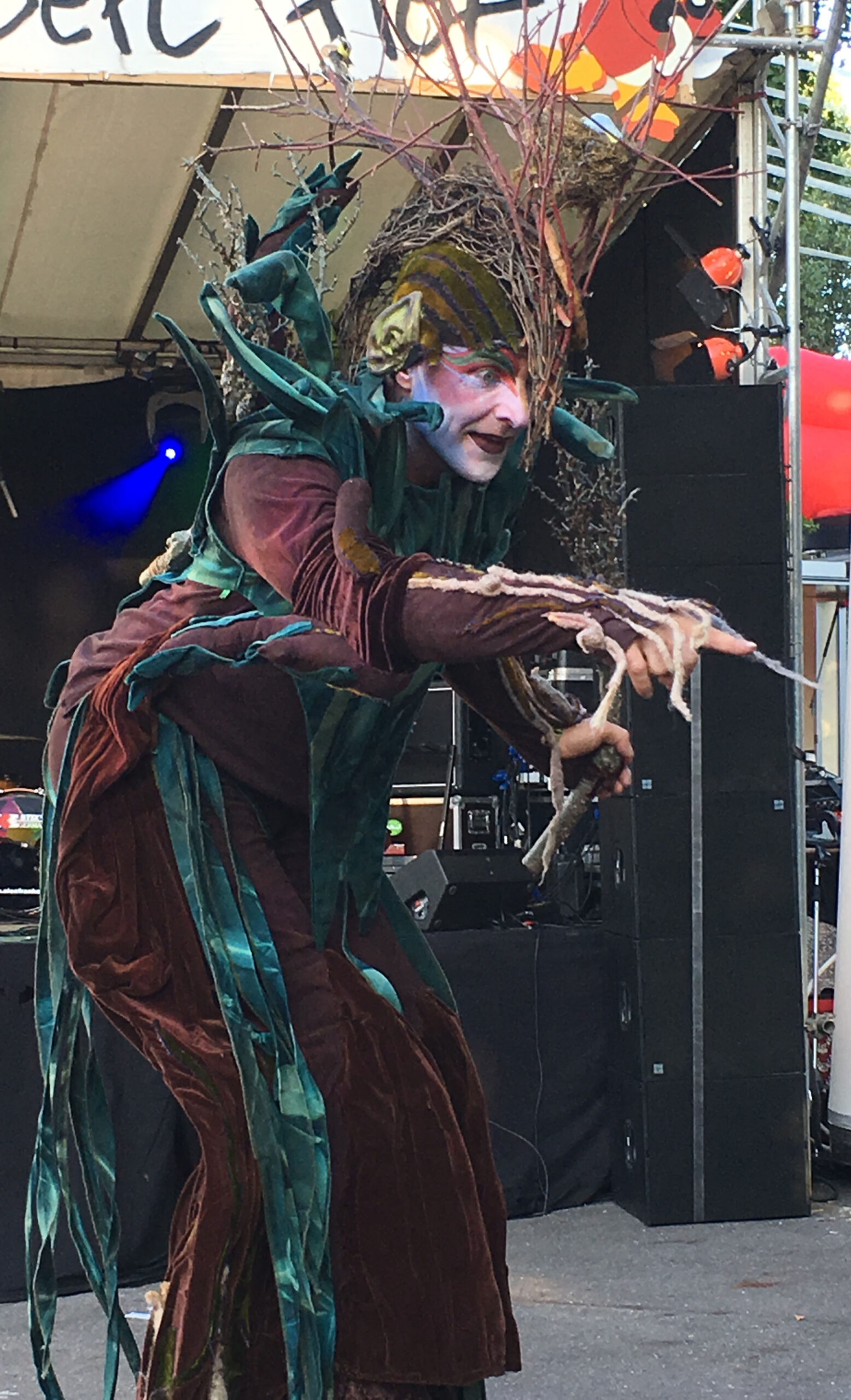 Titania ist mächtig, erdig, und wird umschlungen von Lianen, duftend nach Moos. Luftwurzeln suchen sich ihren Weg. Der Blick des Betrachters verirrt sich in ihrem Kleid ob dieser unzähligen Details, die es zu entdecken gibt. Ein Sommernachtsmärchenwald ist ihr Zuhause. Oberon, ein Baum, der Früchte aller Art trägt. Ein Apfelbaum, den starke Wurzeln verankern und dem Stelzen Halt geben. Er steht für alles Pflanzliche, die Jahreszeiten und ein gutes, ertragreiches Erntedankfest.