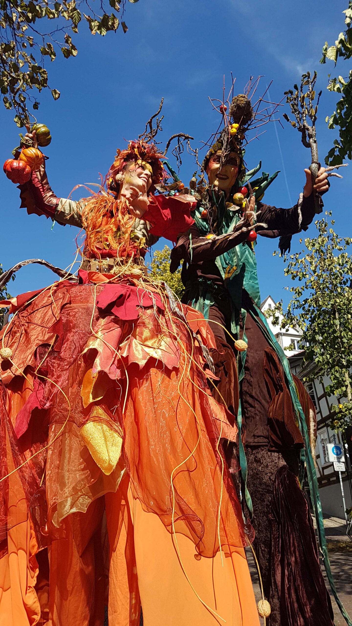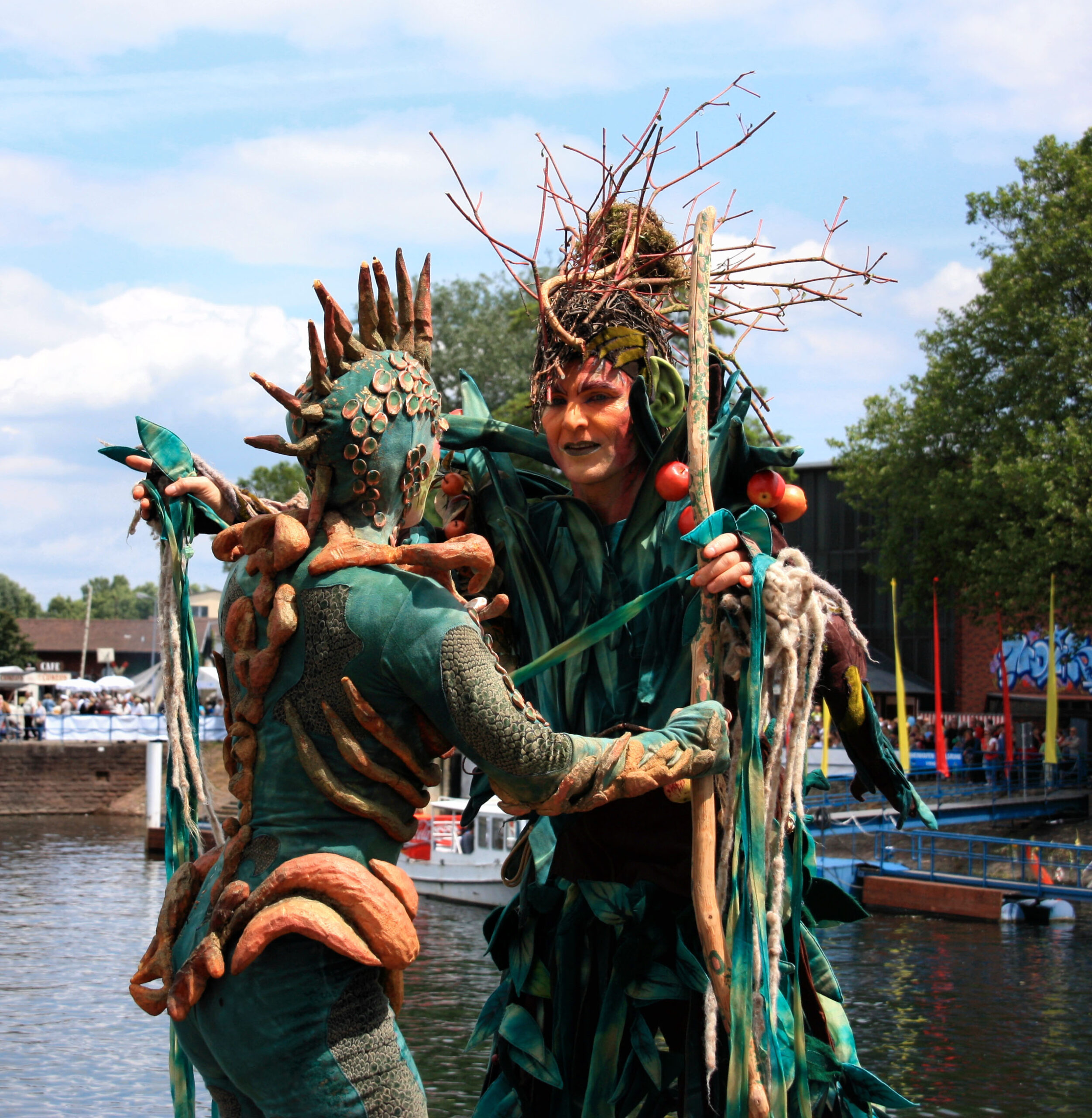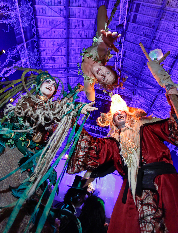 Titania ist mächtig, erdig, und wird umschlungen von Lianen, duftend nach Moos. Luftwurzeln suchen sich ihren Weg. Der Blick des Betrachters verirrt sich in ihrem Kleid ob dieser unzähligen Details, die es zu entdecken gibt. Ein Sommernachtsmärchenwald ist ihr Zuhause. Oberon, ein Baum, der Früchte aller Art trägt. Ein Apfelbaum, den starke Wurzeln verankern und dem Stelzen Halt geben. Er steht für alles Pflanzliche, die Jahreszeiten und ein gutes, ertragreiches Erntedankfest.
