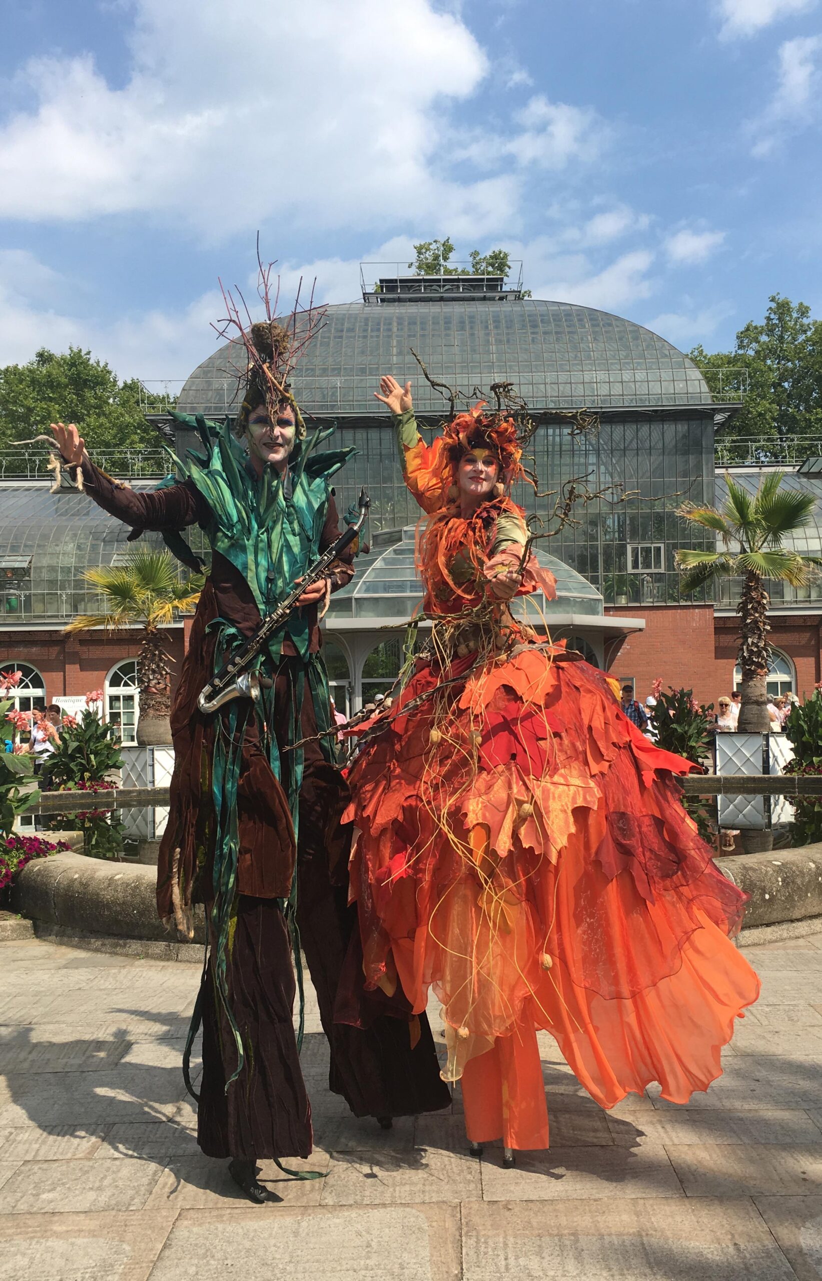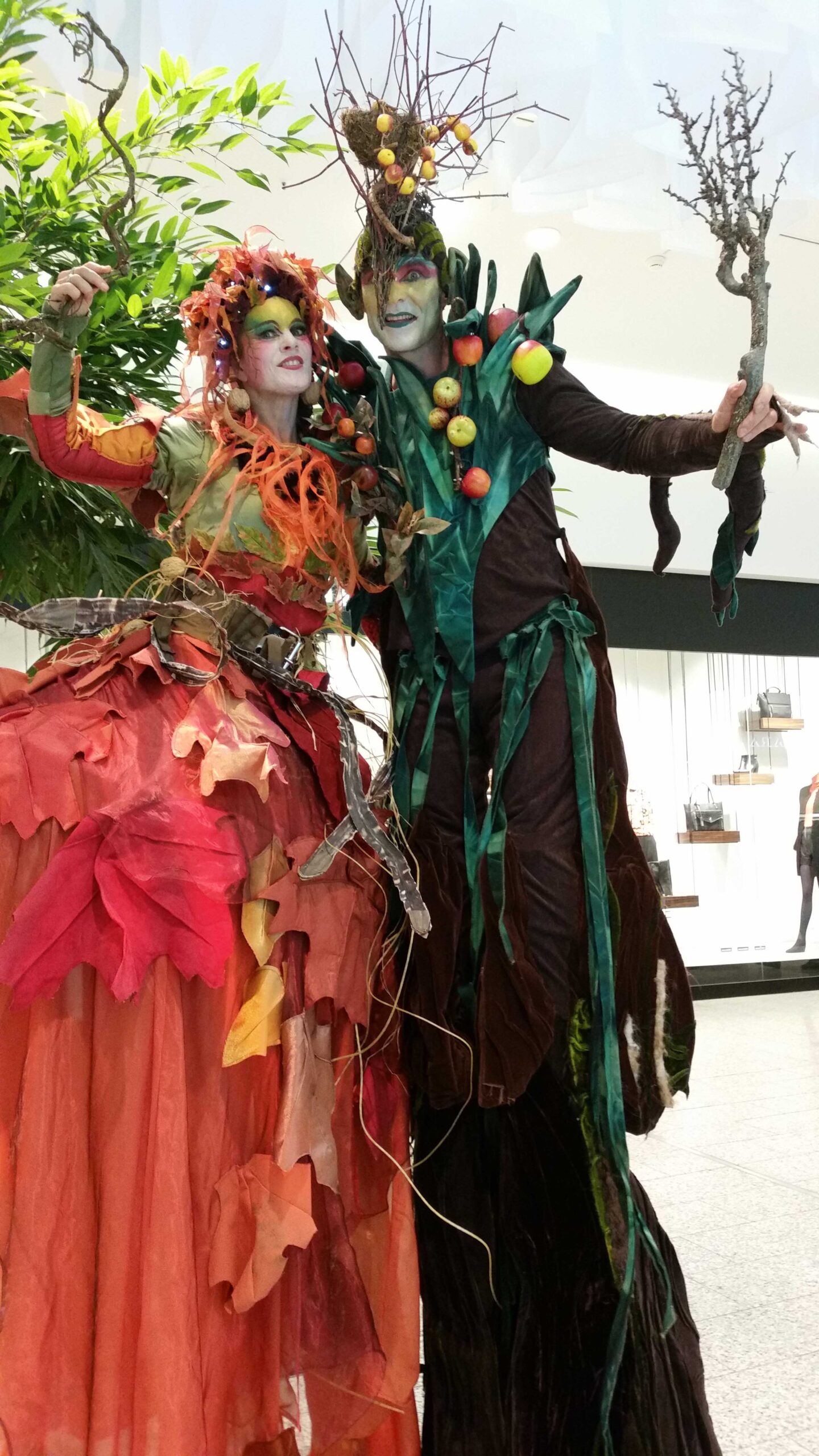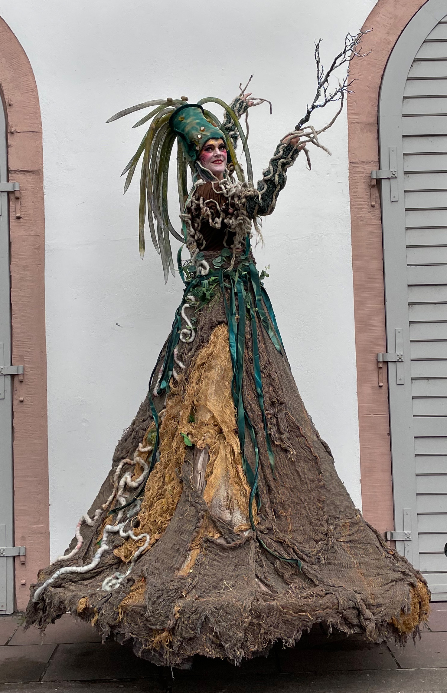 Titania ist mächtig, erdig, und wird umschlungen von Lianen, duftend nach Moos. Luftwurzeln suchen sich ihren Weg. Der Blick des Betrachters verirrt sich in ihrem Kleid ob dieser unzähligen Details, die es zu entdecken gibt. Ein Sommernachtsmärchenwald ist ihr Zuhause. Oberon, ein Baum, der Früchte aller Art trägt. Ein Apfelbaum, den starke Wurzeln verankern und dem Stelzen Halt geben. Er steht für alles Pflanzliche, die Jahreszeiten und ein gutes, ertragreiches Erntedankfest.